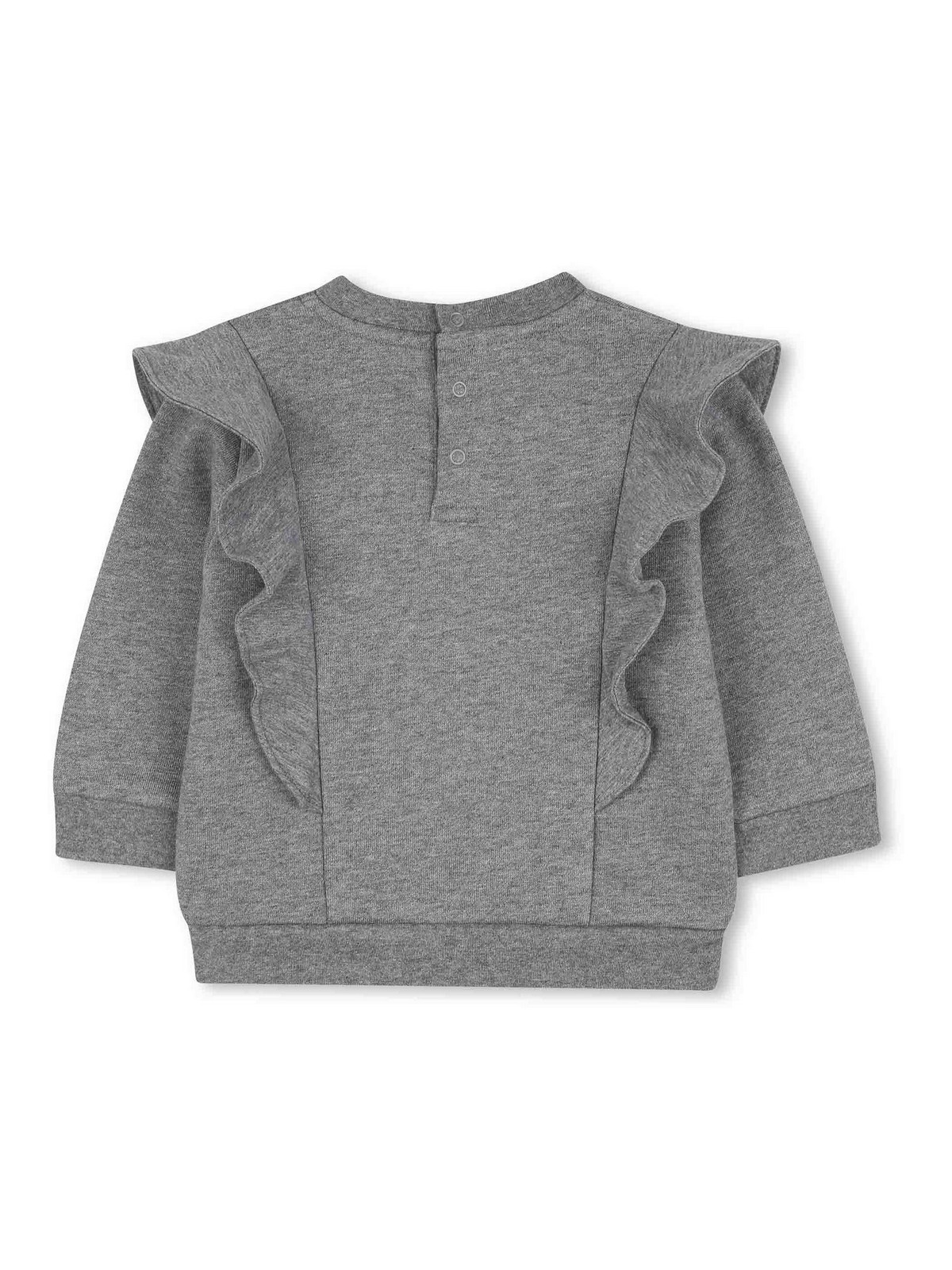 Cuello redondo gris con volantes, estampado del logotipo en la parte trasera y tapeta con botones a presión