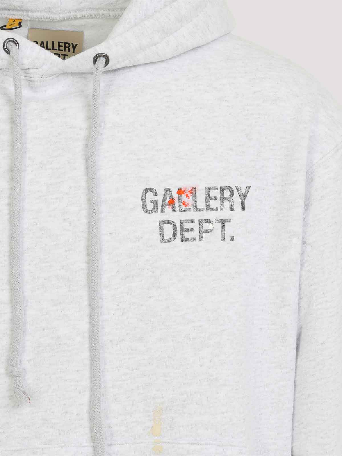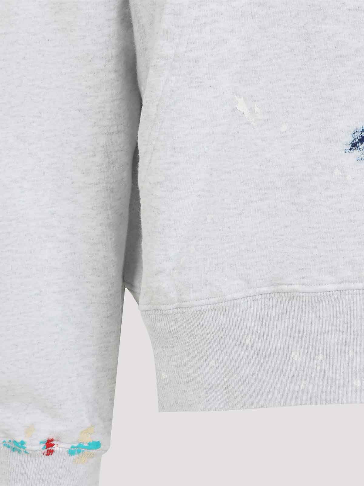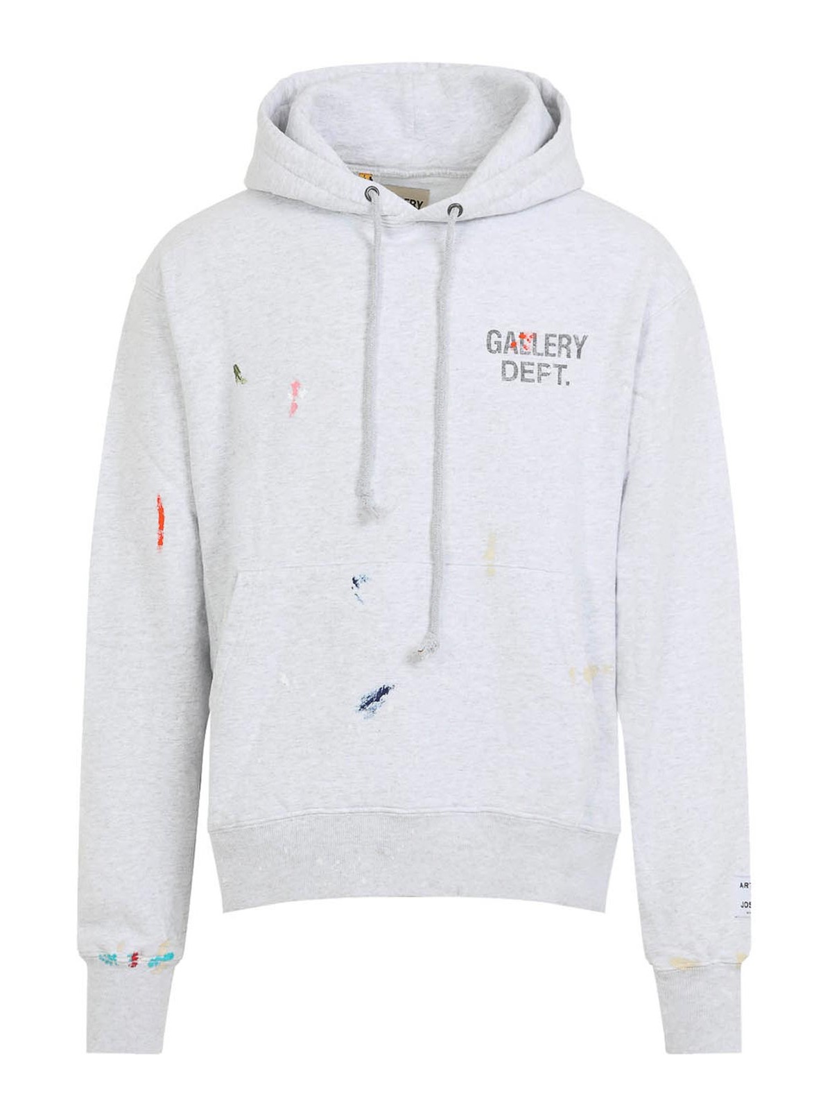 Sudadera con capucha con el logotipo GD Paint de algodón gris jaspeado de Gallery Dept. Confeccionada en una mezcla de algodón y poliéster. Capucha tonal, detalles de cordón tonal en la parte delantera, logotipo con letras grises en el pecho, bolsillos canguro, logotipo con letras grises en la parte trasera, mangas largas, puños y dobladillo acanalados, dobladillo recto. Detalles multicolores manchados en toda la prenda.
