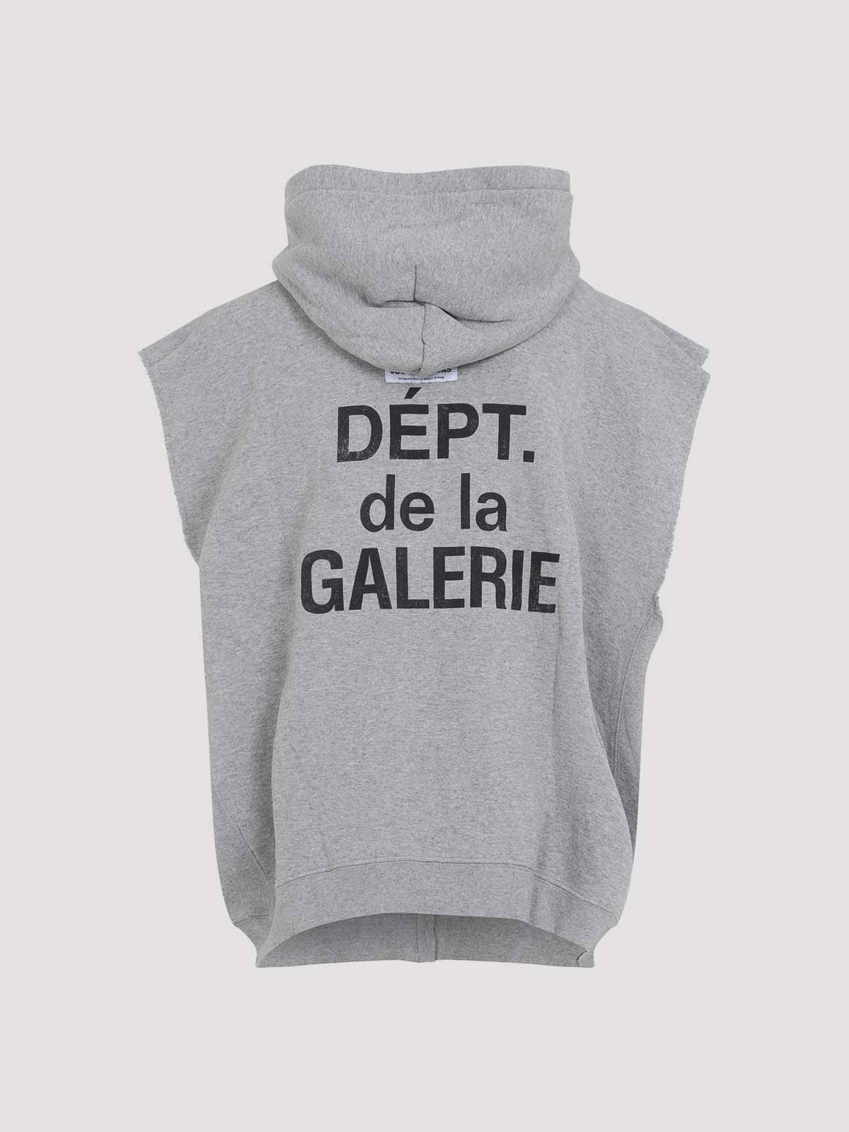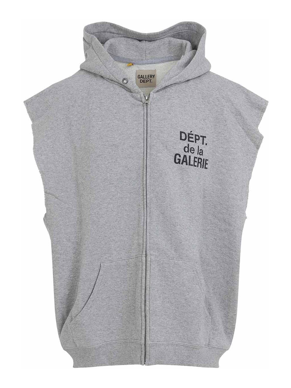 Sudadera con capucha de algodón gris de los años 90 con cierre completo de la marca Gallery Dept. confeccionada en una mezcla de algodón y poliéster. Capucha tonal, logotipo con letras en gris oscuro en el pecho, bolsillos laterales, logotipo con letras en gris oscuro en la parte trasera, sin mangas, dobladillo recto acanalado.