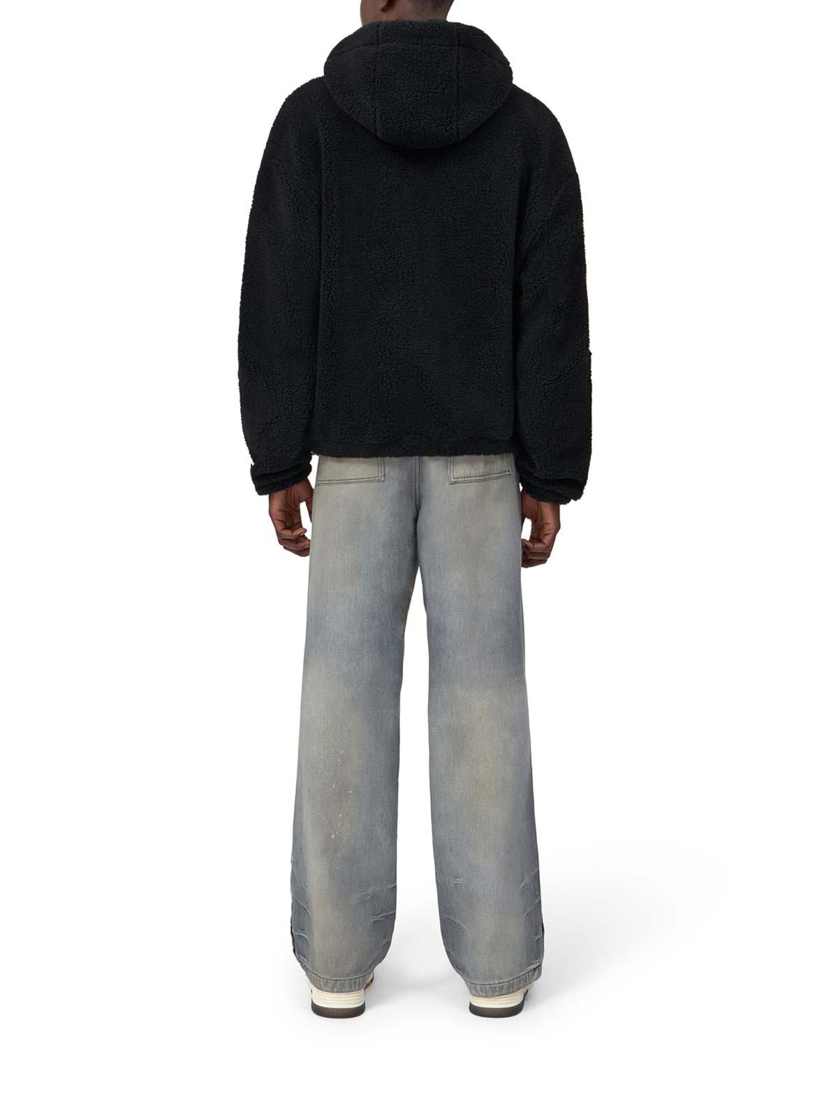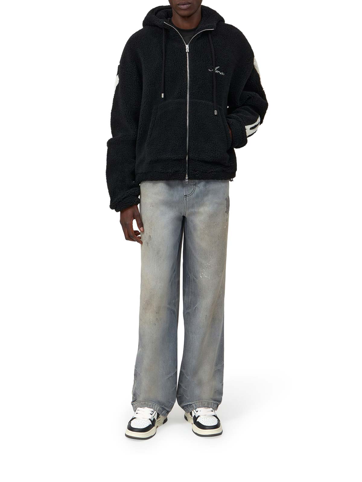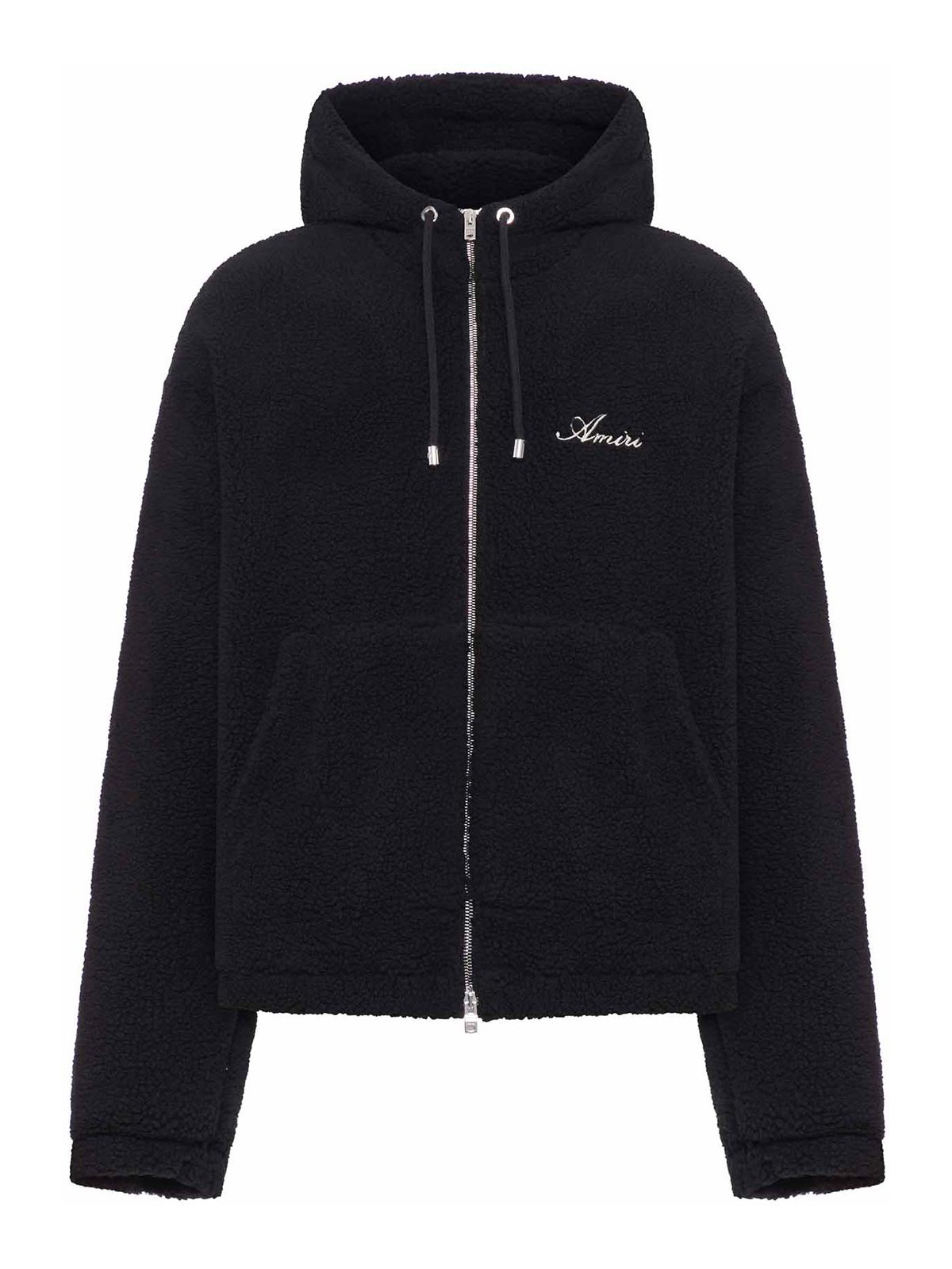 cierre frontal con cremallera metálica bidireccional, capucha con cordón ajustable, mangas largas, logotipo amiri bordado en contraste, bolsillo canguro frontal, bordado de huesos en las mangas, efecto osito, color: negro