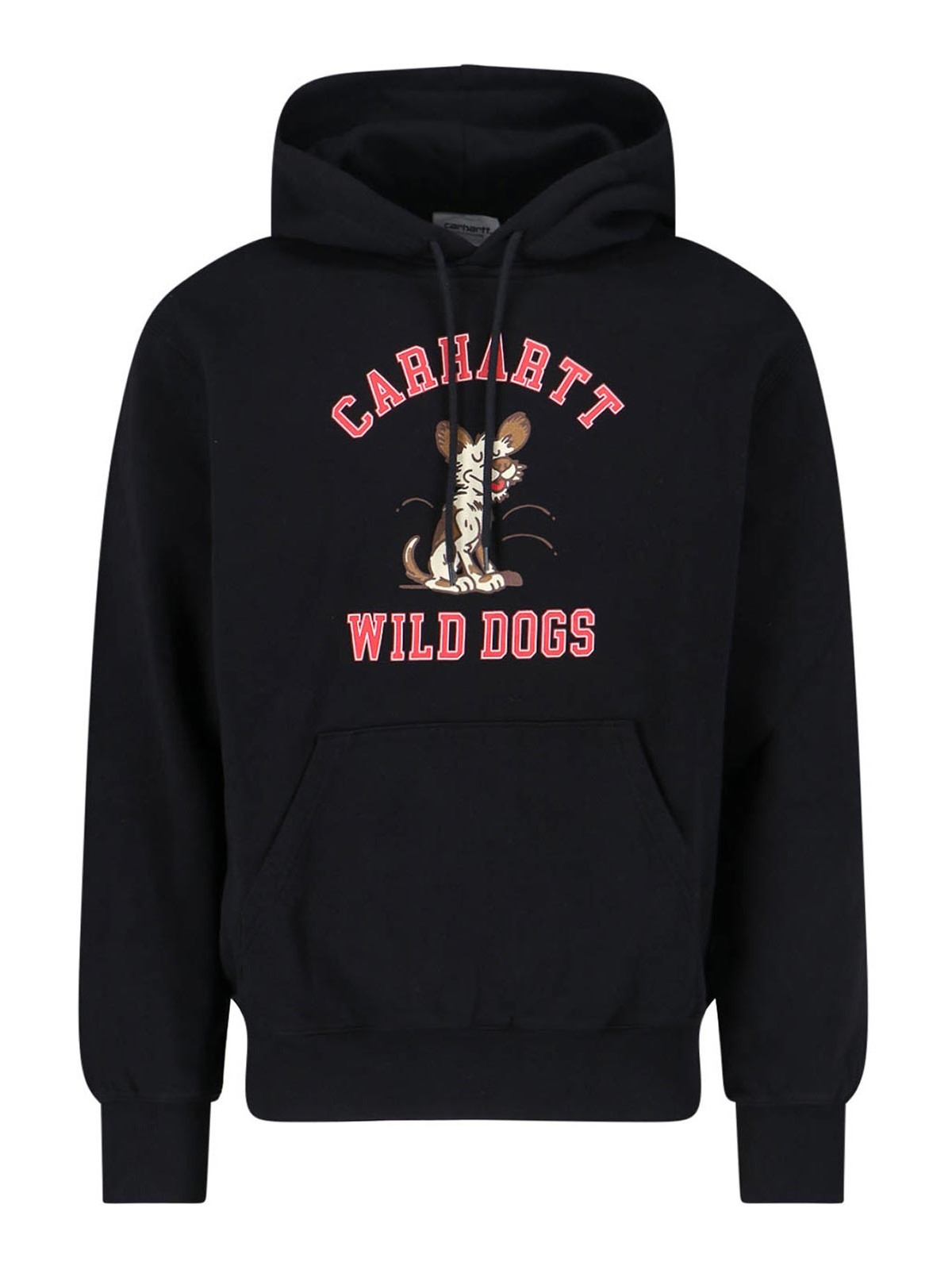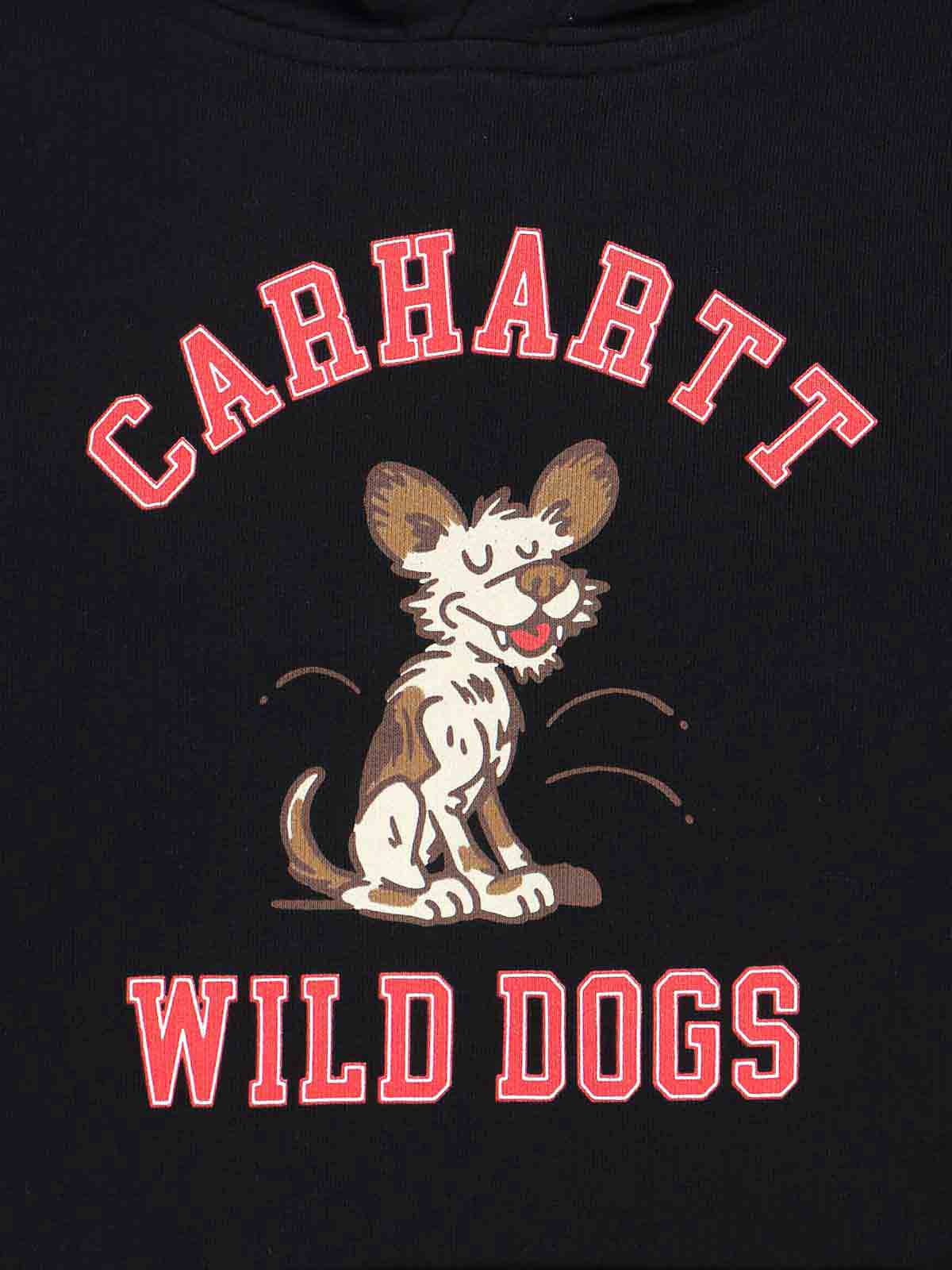 Sudadera con capucha Carhartt Wip Wild Dog, en algodón negro, capucha con cordón, hombros caídos, manga larga, un bolsillo frontal largo, detalle del logotipo estampado de perros salvajes en contraste en la parte delantera, cintura y puños elásticos, dobladillo recto.