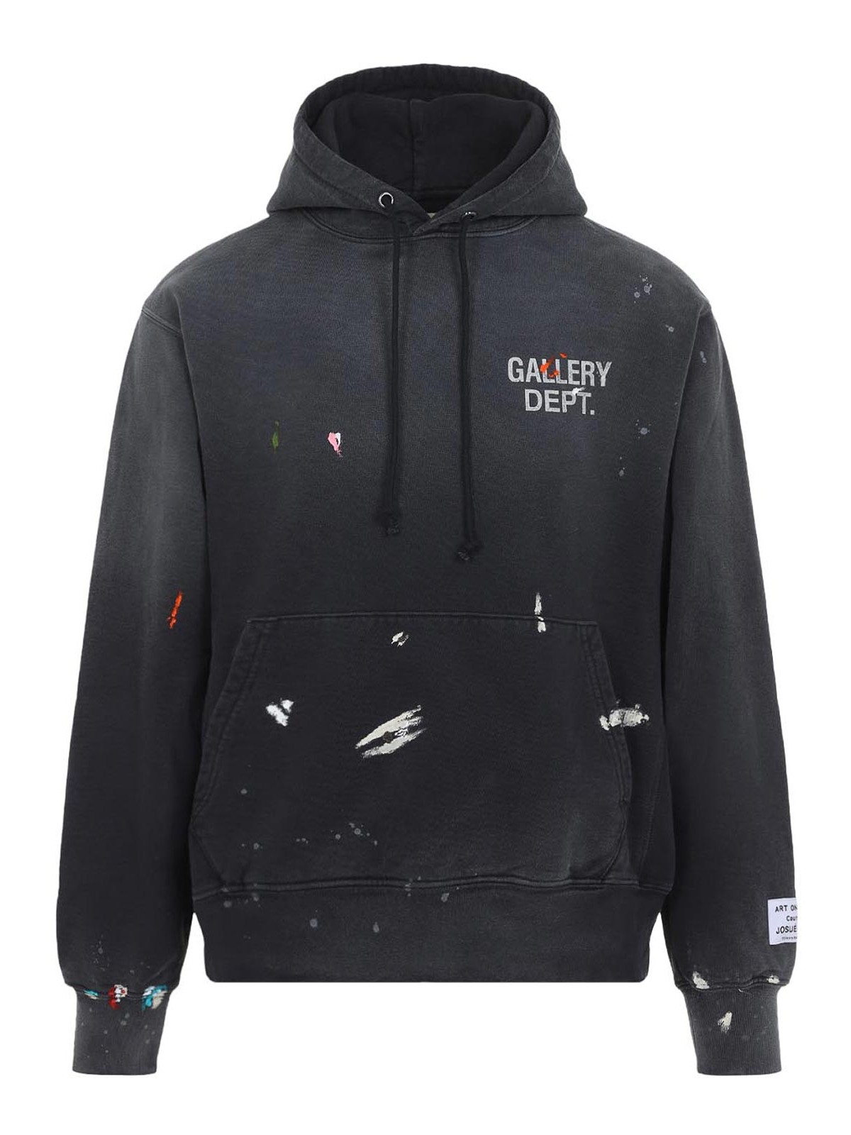 Sudadera con capucha vintage de algodón negro con el logotipo GD Paint de Gallery Dept. Confeccionada en una mezcla de algodón y poliéster. Capucha tonal, detalles de cordón tonal en la parte delantera, logotipo con letras grises en el pecho, bolsillos canguro, logotipo con letras grises en la parte trasera, mangas largas, puños y dobladillo acanalados, dobladillo recto. Detalles multicolores manchados en toda la prenda.
