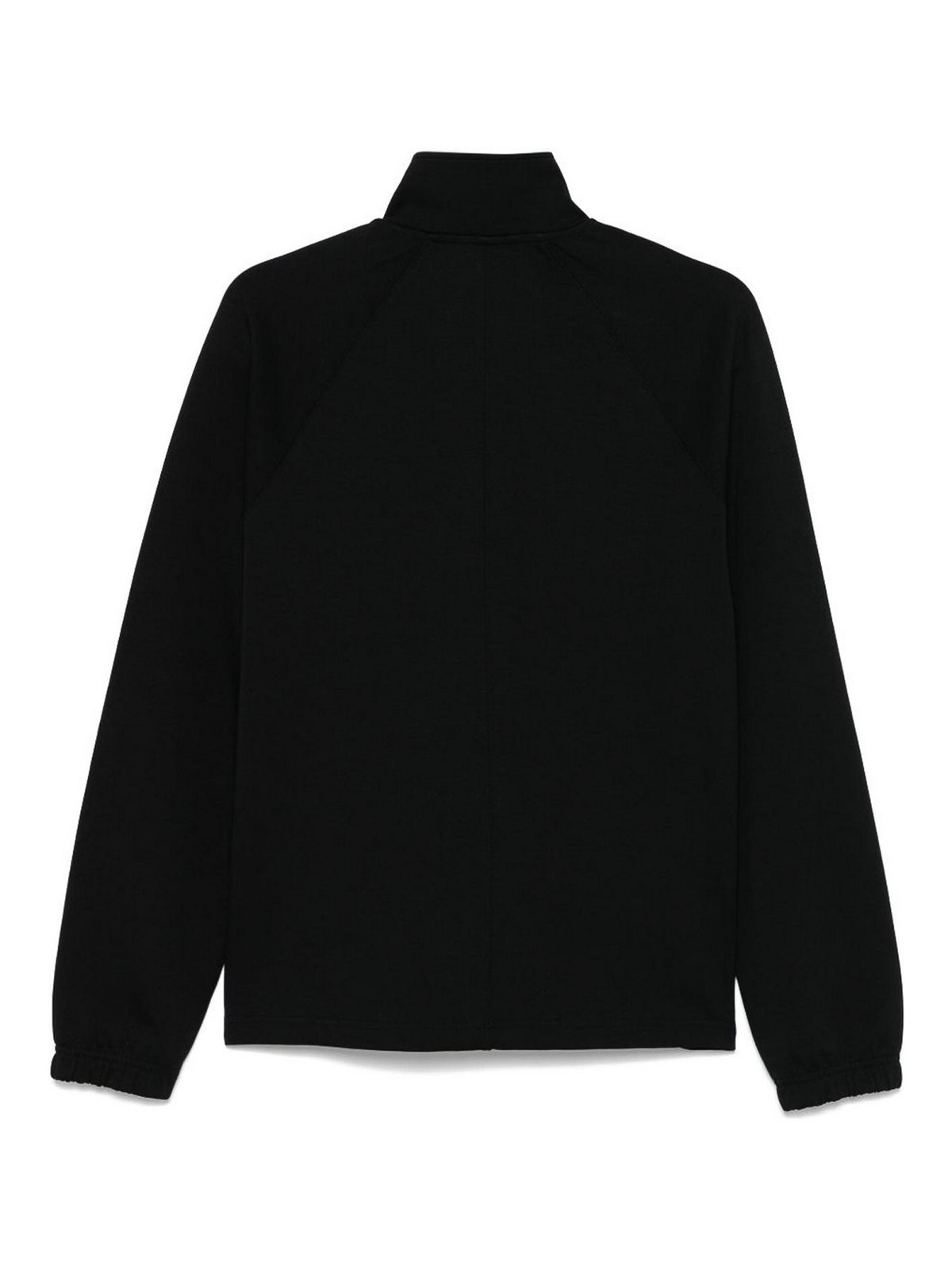 Cierre frontal negro con cremallera, cuello alto, mangas largas, dos bolsillos laterales