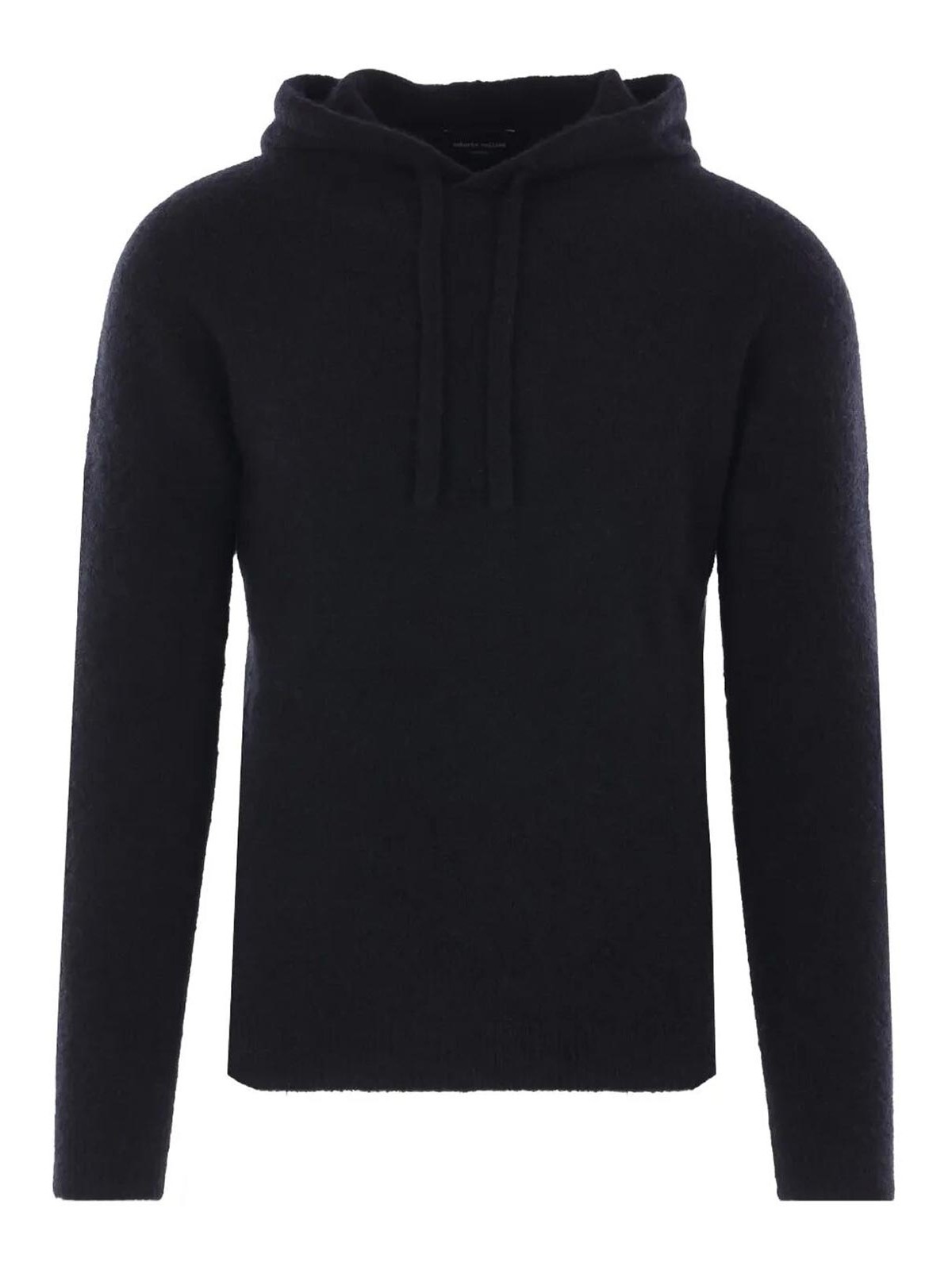 Sudadera negra de cachemir y seda de Roberto Collina, capucha con cordones ajustables, bordes acanalados.