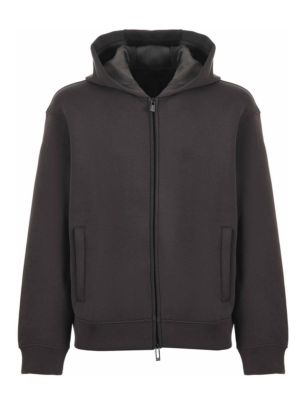Sudadera Emporio Armani en tejido efecto neopreno. Capucha con forro de terciopelo. Forro de terciopelo. Logotipo en la parte delantera a juego. Mangas largas. Bolsillos canguro. Cierre con cremallera de doble deslizador. talla mostrada: m 45% poliéster, 24% lyocell, 24% algodón, 7% elastano
