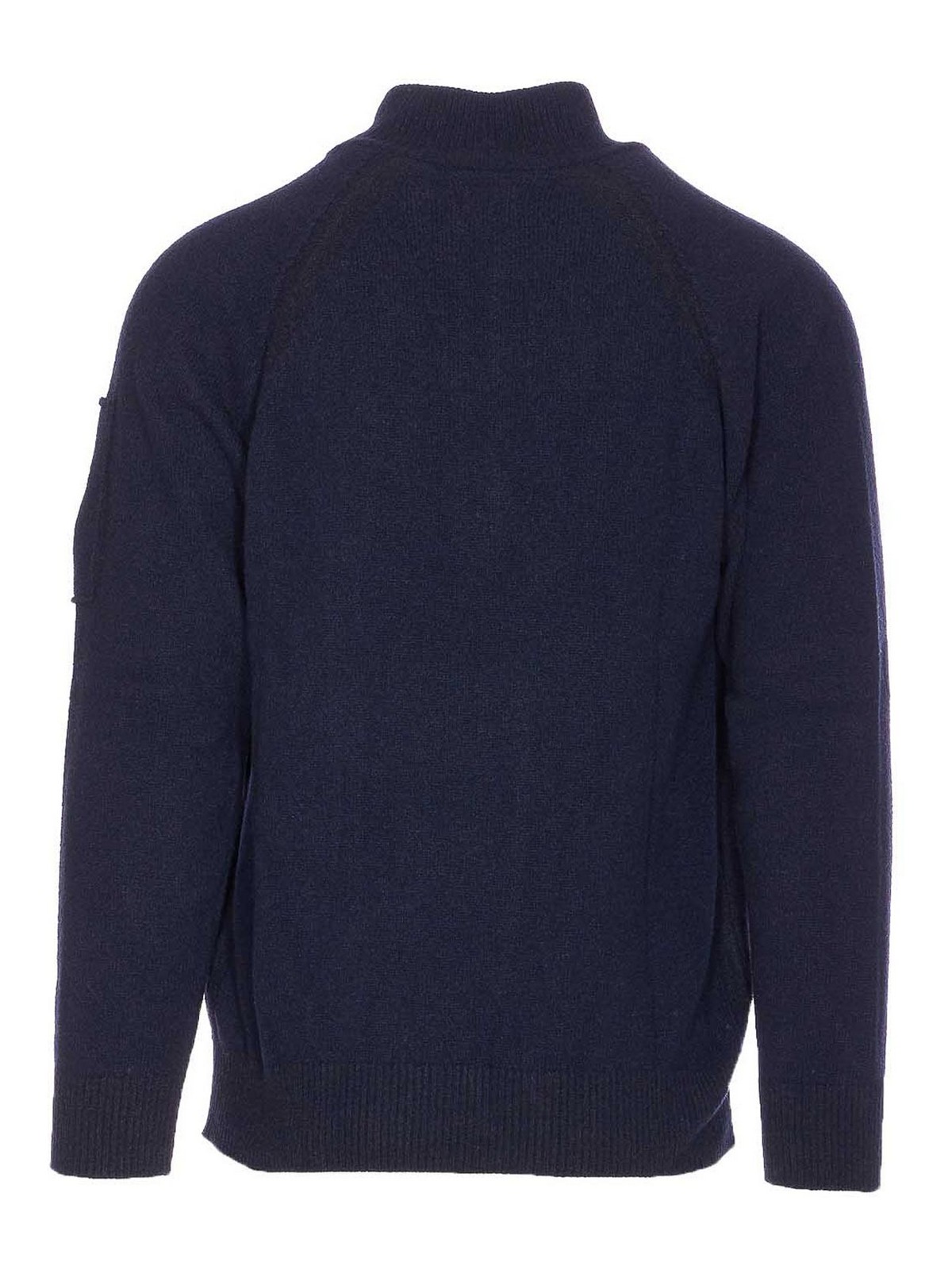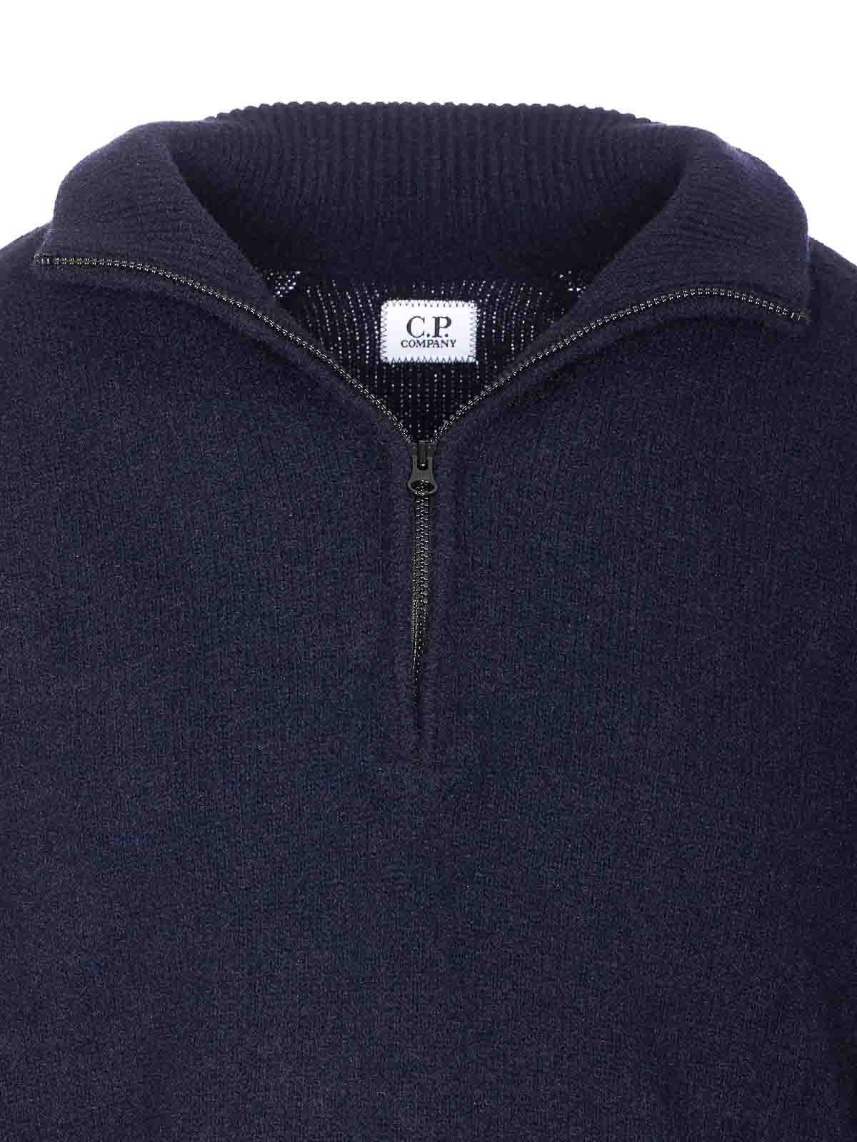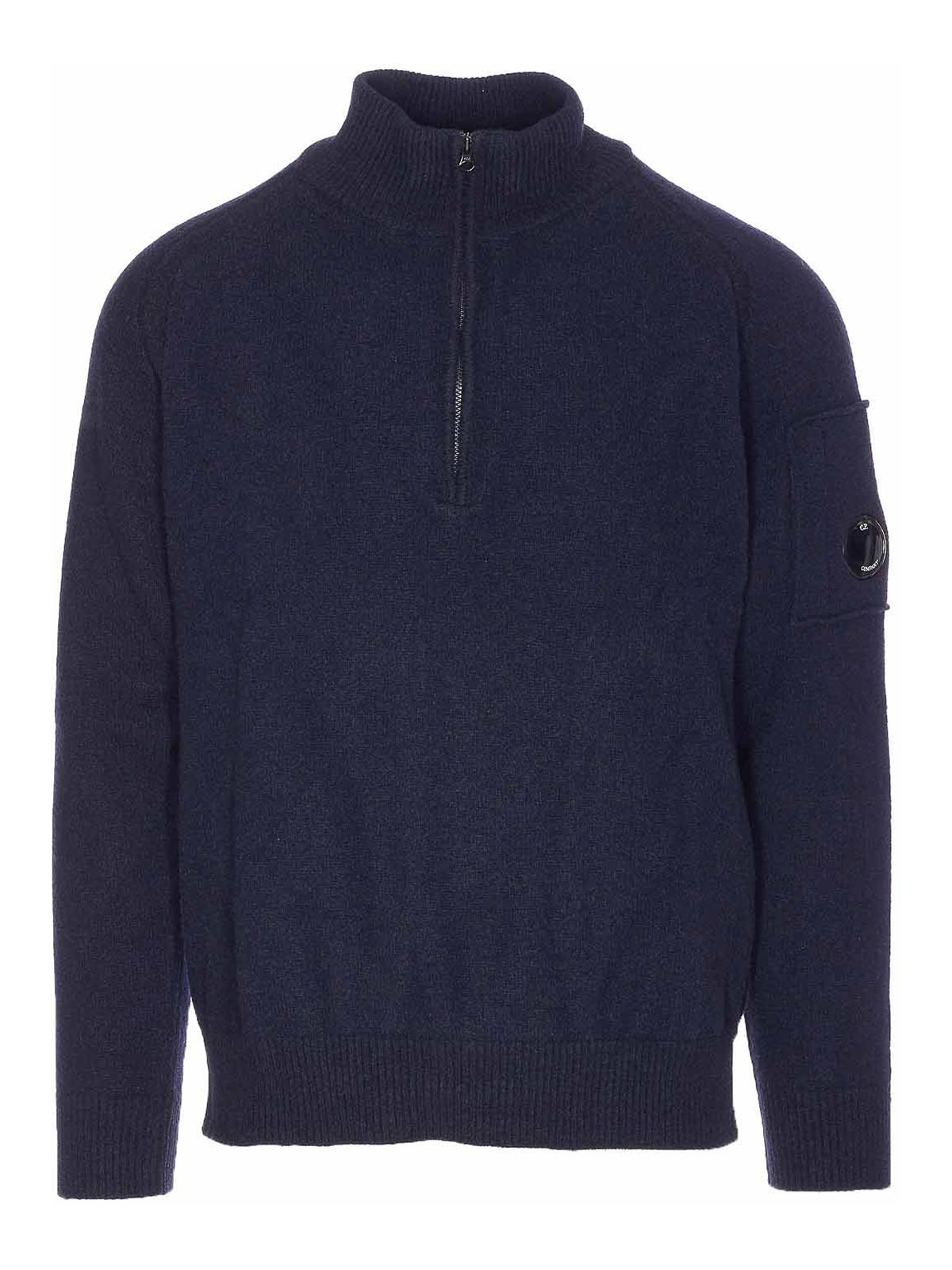 Prendas de punto azules de C.P. company, cierre con media cremallera, logotipo de parche lateral, cuello alto