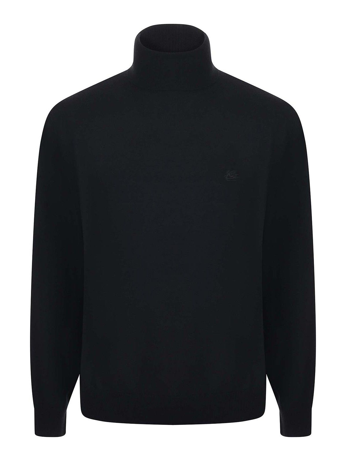 Jersey Etro de cuello alto de lana negra ligera. Cuello alto con dobladillo. Mangas largas. Puños y dobladillo acanalados. Logotipo bordado a juego en la parte delantera. Corte regular. Talla mostrada: m 100% lana
