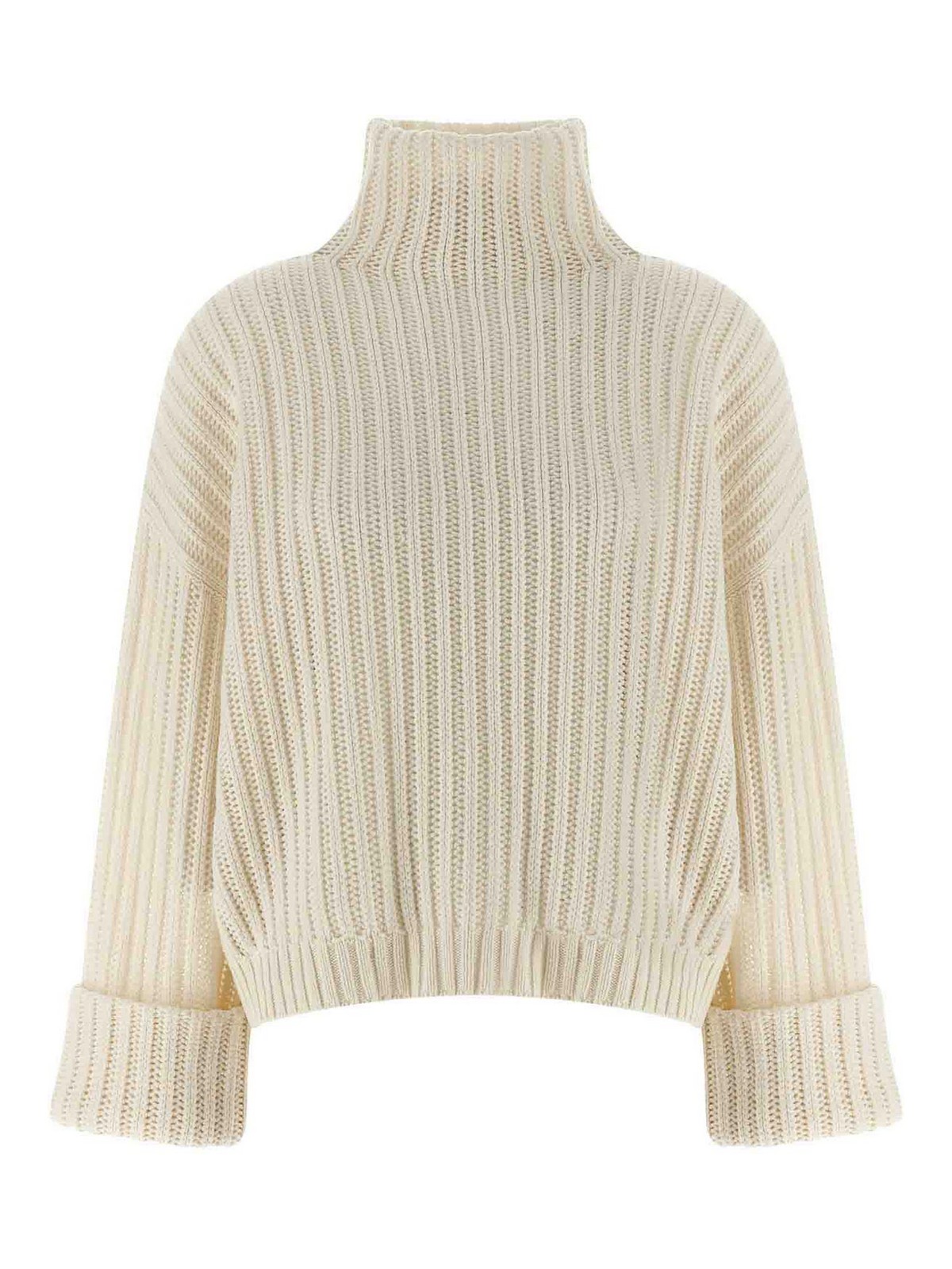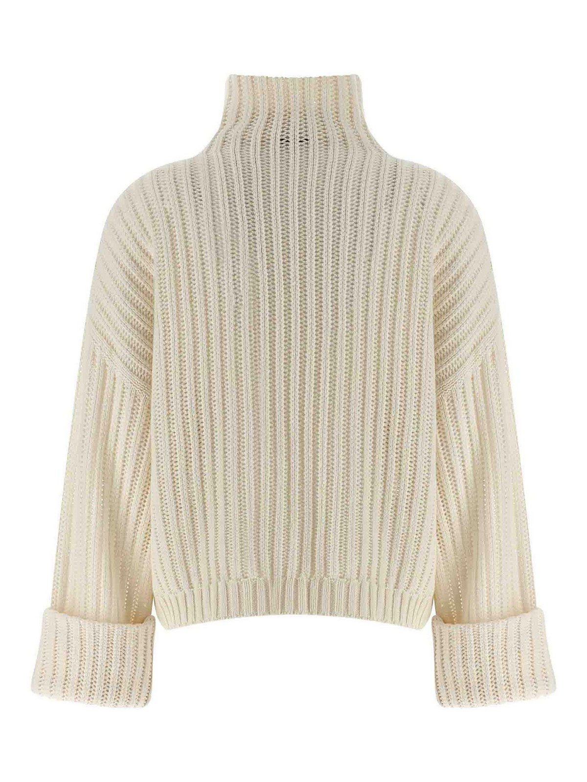 Jersey de cuello alto de cachemir de punto con tejido ancho y nervaduras, cuello, cuello alto, mangas largas con puños doblados y hombros caídos.