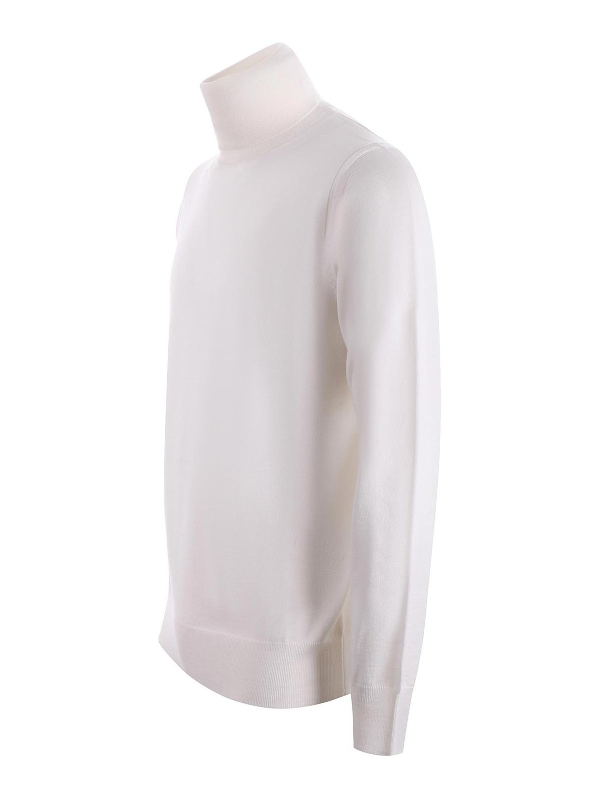 Jersey Paolo pecora dolce vita de lana virgen. Cuello alto con solapa. Mangas largas. Puños y dobladillo acanalados. Calibre 16. La talla M se muestra en la foto 100% lana virgen