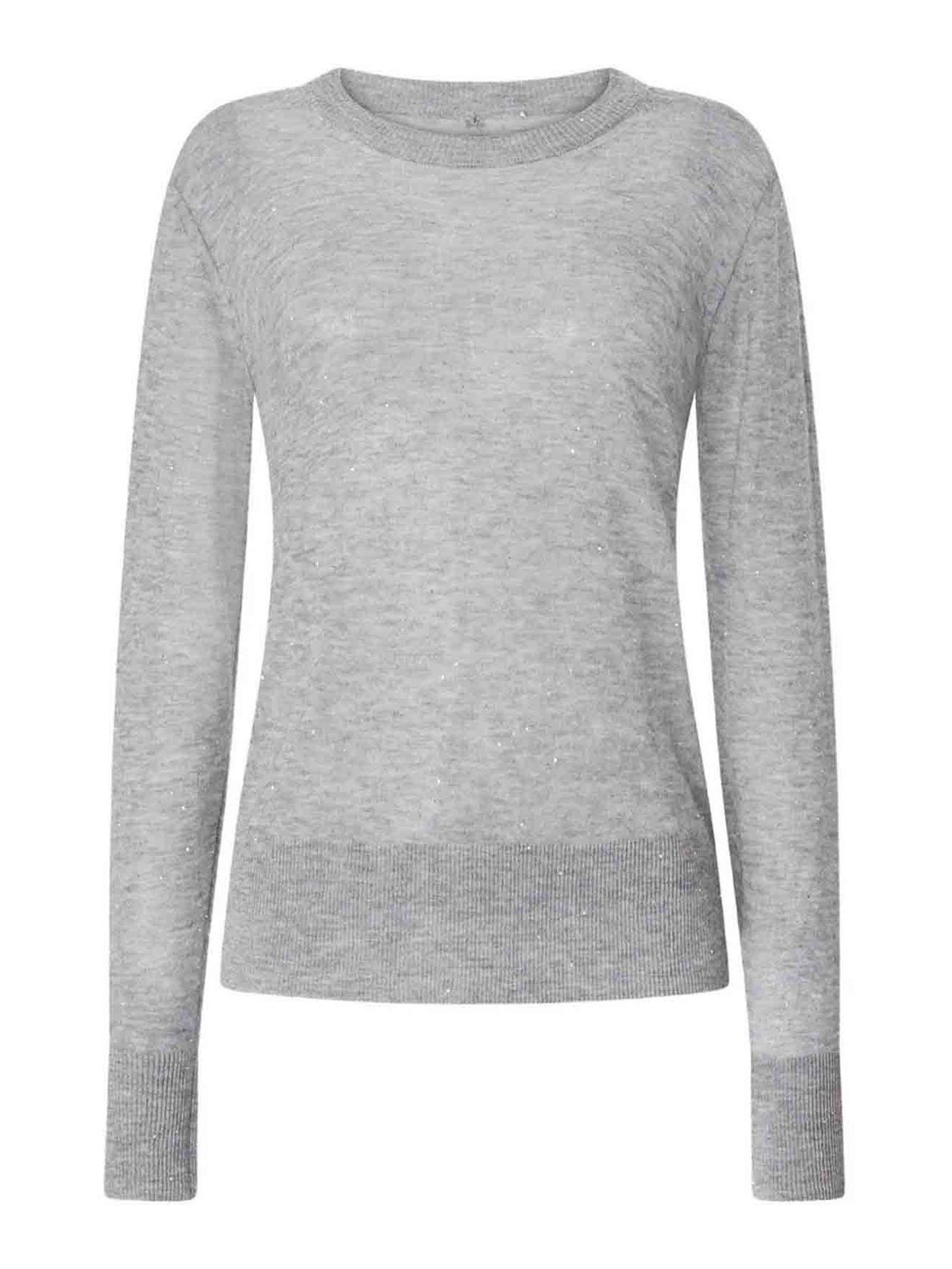 Jersey de cuello redondo y manga larga confeccionado en lana ultrafina de primera calidad, un hilo que se caracteriza por una estructura ligera, pequeños apliques de lentejuelas y dobladillo y puños acanalados. Composición: 98% lana, 2% poliéster fabricado en Italia