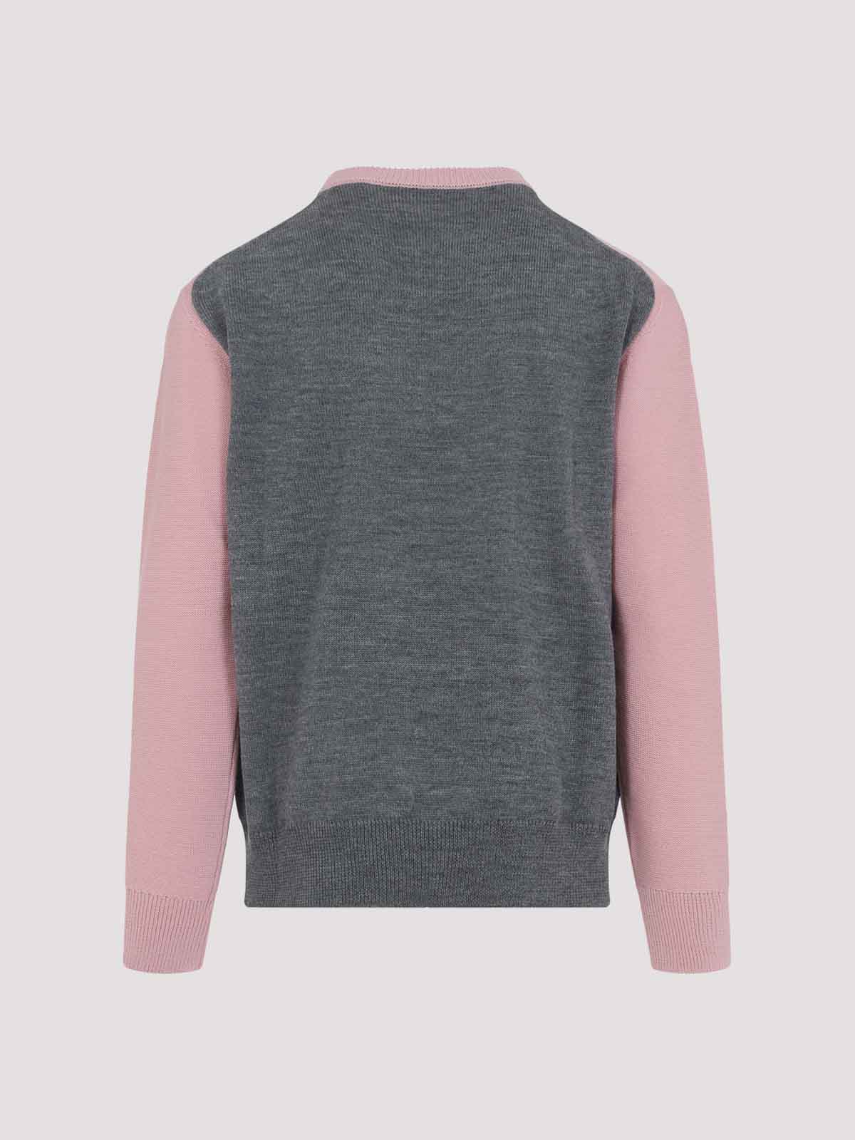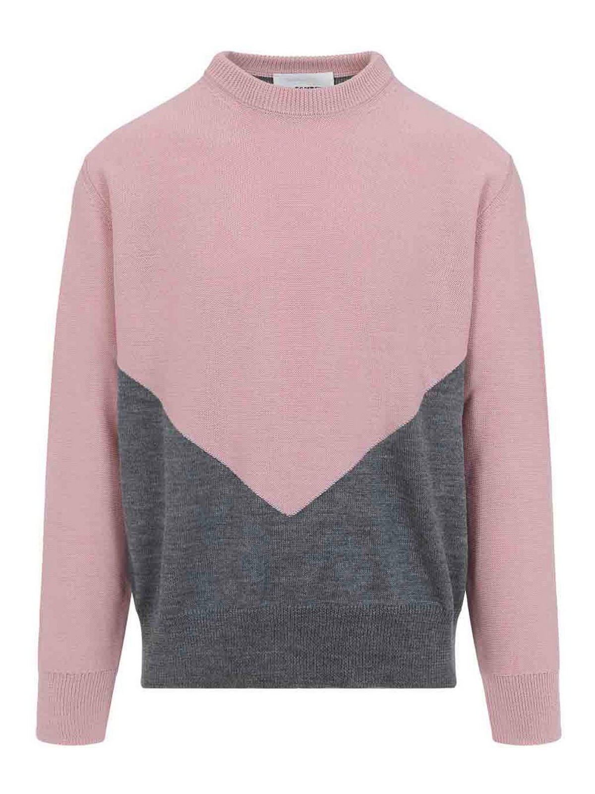 Jersey de manga larga Jil Sander de lana rosa Cn. Jersey de pura lana, cuello redondo acanalado, mangas largas, puños y dobladillo acanalados, dobladillo recto. Fondo rosa con diseño geométrico gris.