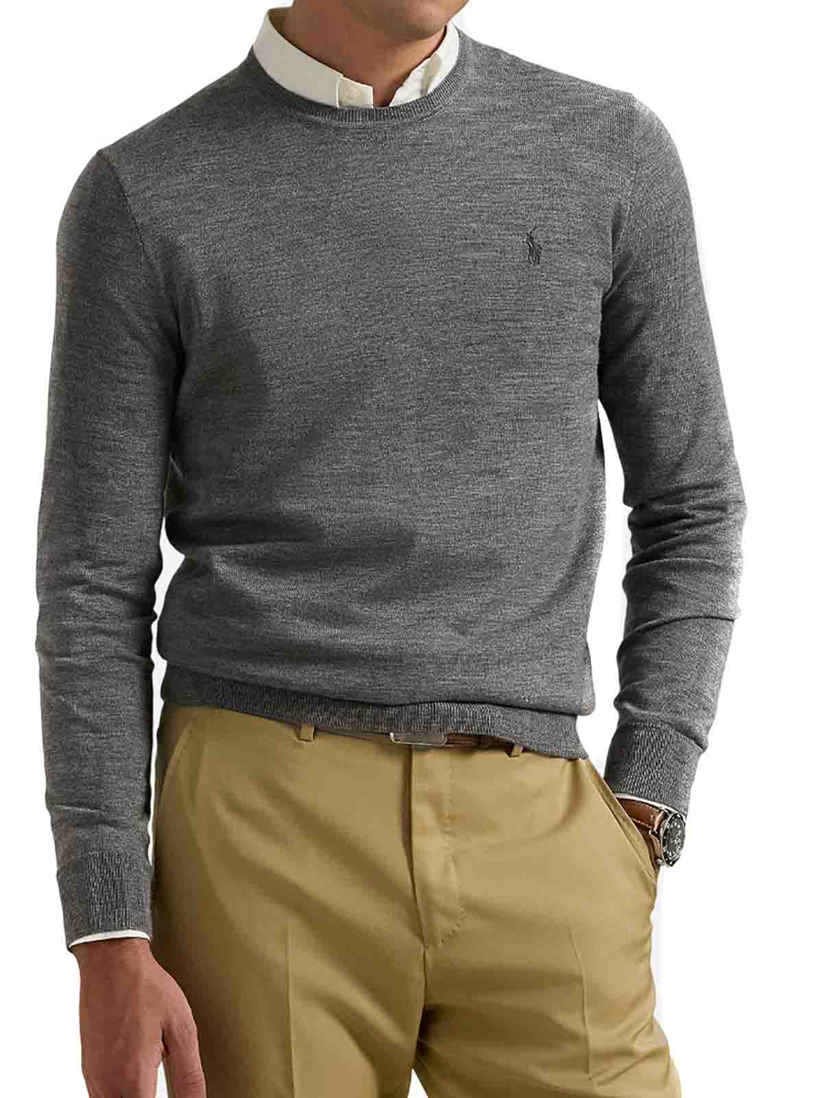 Jersey gris de polo ralph lauren con punto fino, cuello redondo, manga larga, dobladillo recto, logotipo bordado en el pecho