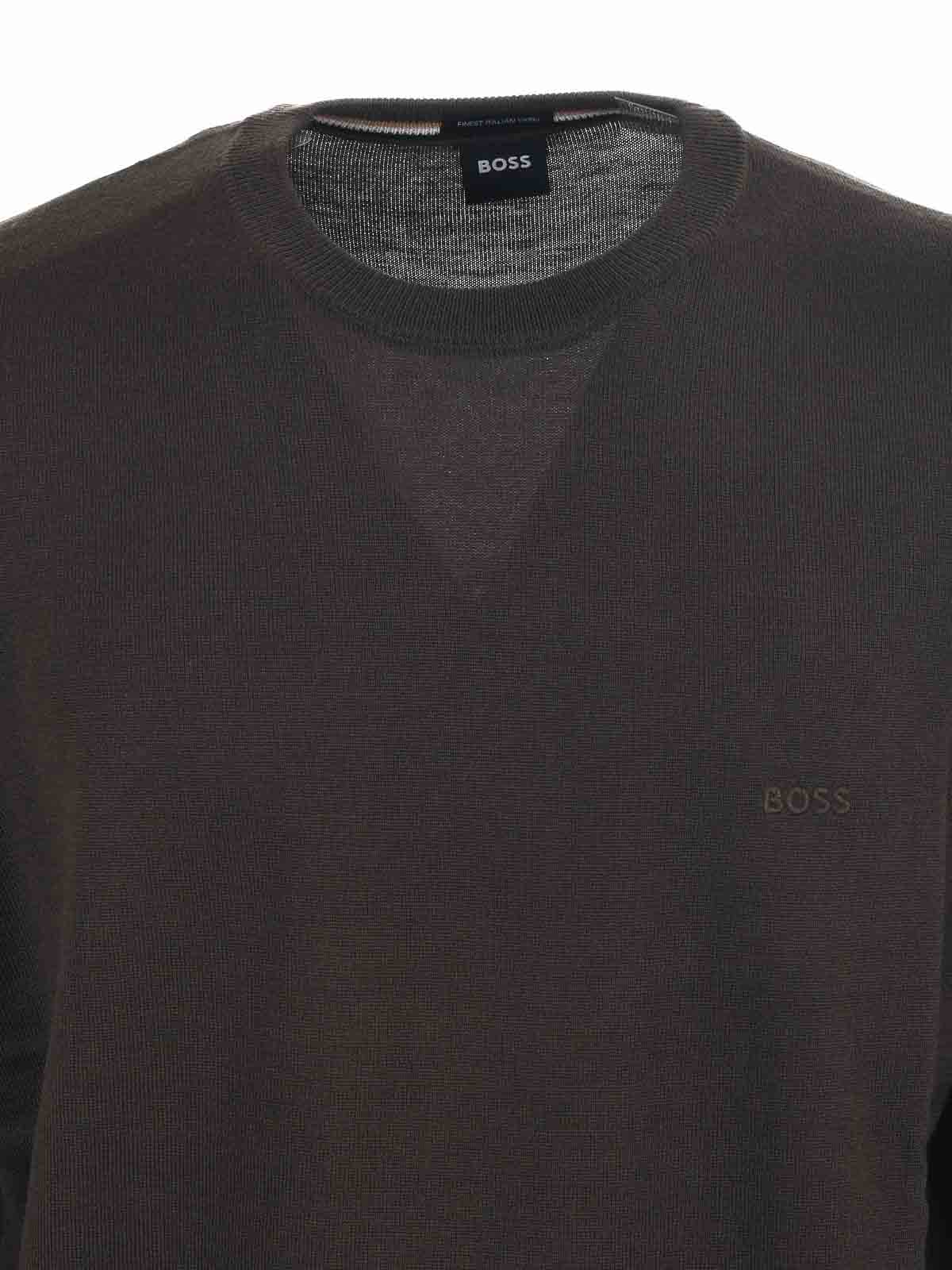 Jersey Boss de lana virgen, verde militar, cuello redondo, mangas largas, puños y dobladillo acanalados. Talla M en la foto. 100% lana virgen.