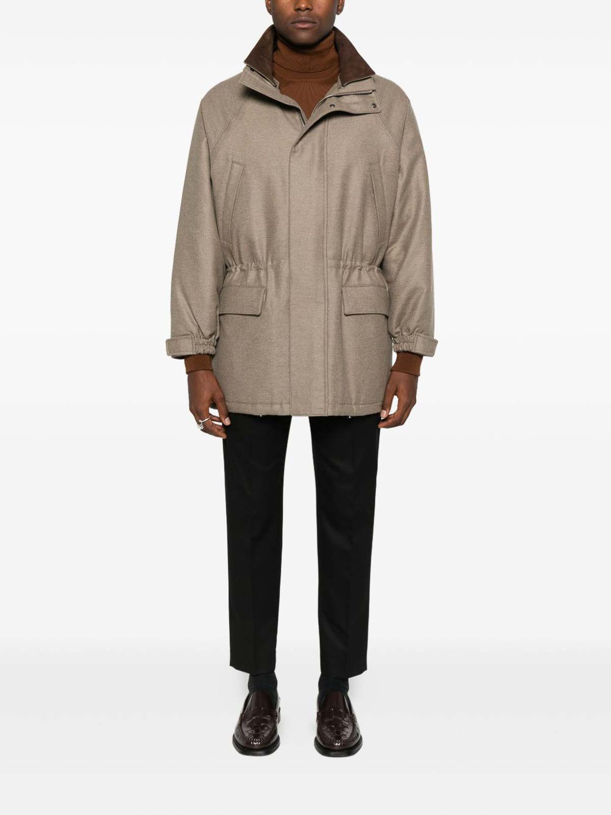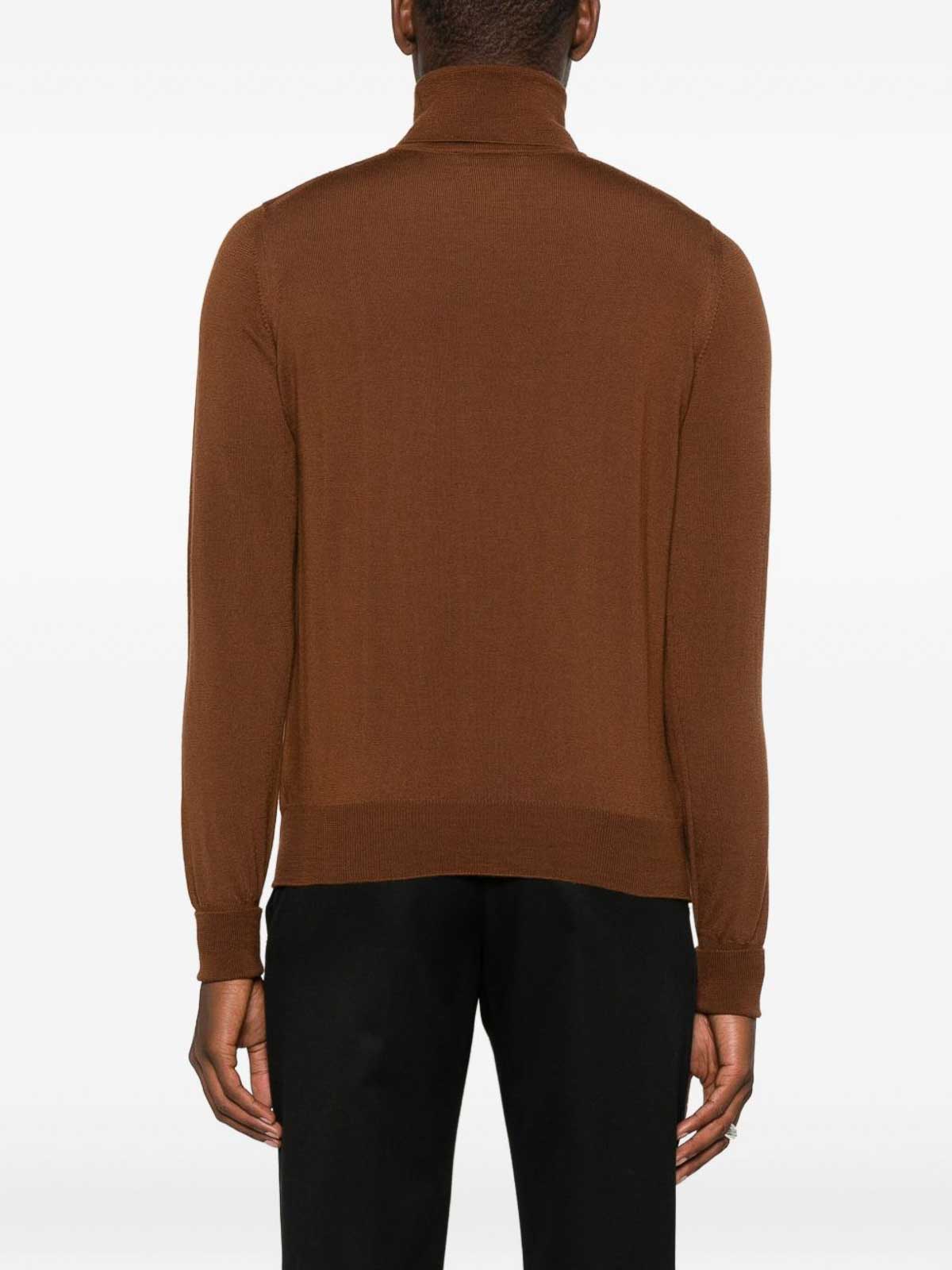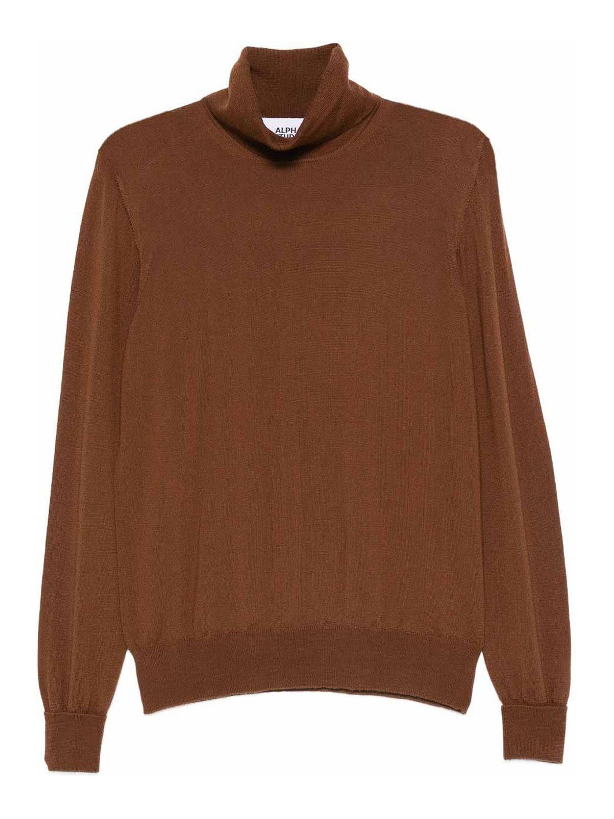 Cuello vuelto marrón, mangas largas, puños y dobladillo acanalados, punto fino
