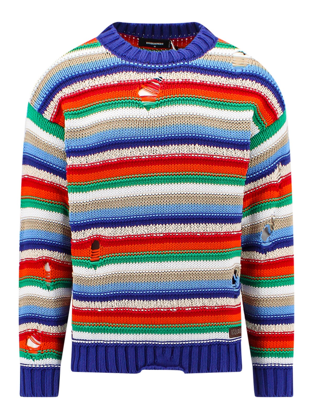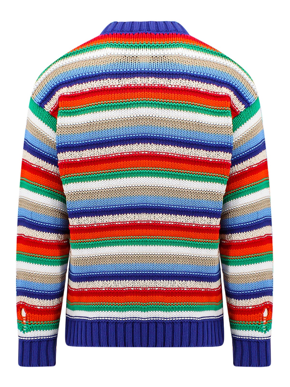 Jersey a rayas multicolores con efecto destrozado con cuello redondo acanalado, manga larga con puño acanalado, parche con logotipo en piel,