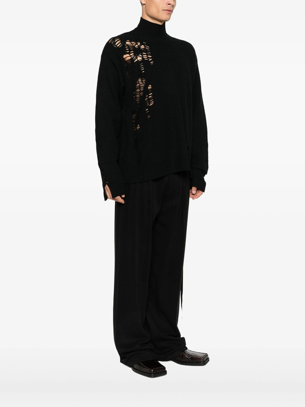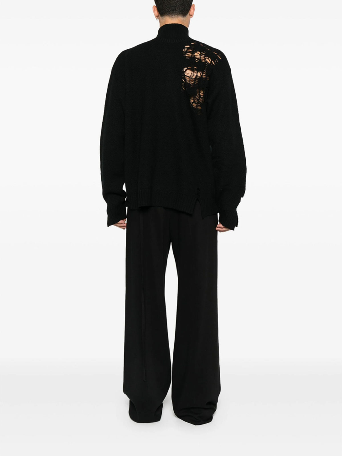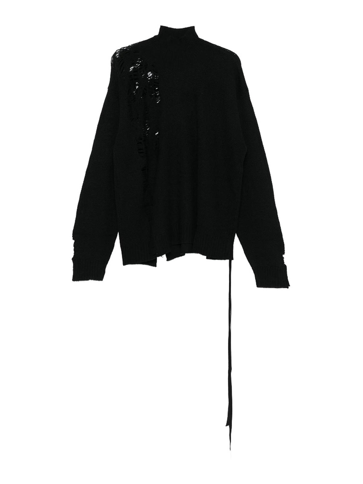 Cuello alto negro, bordes deshilachados, dobladillo asimétrico, mangas largas