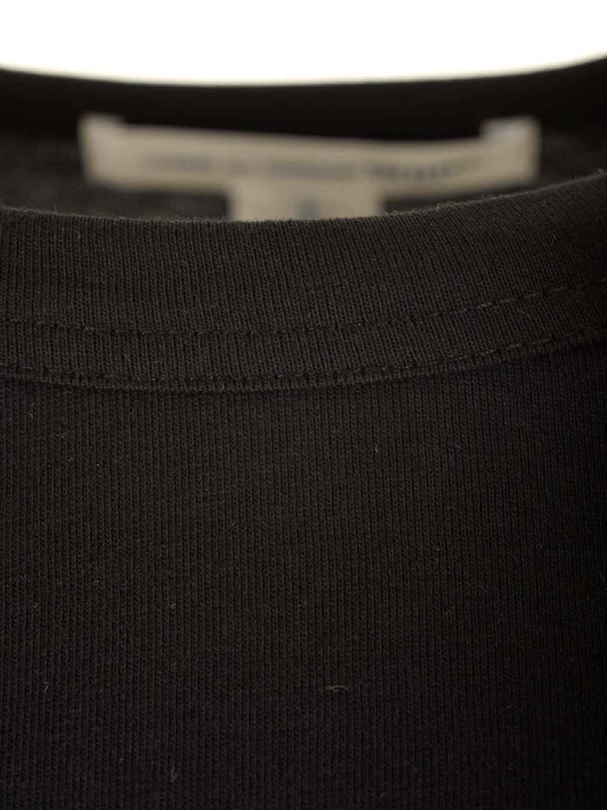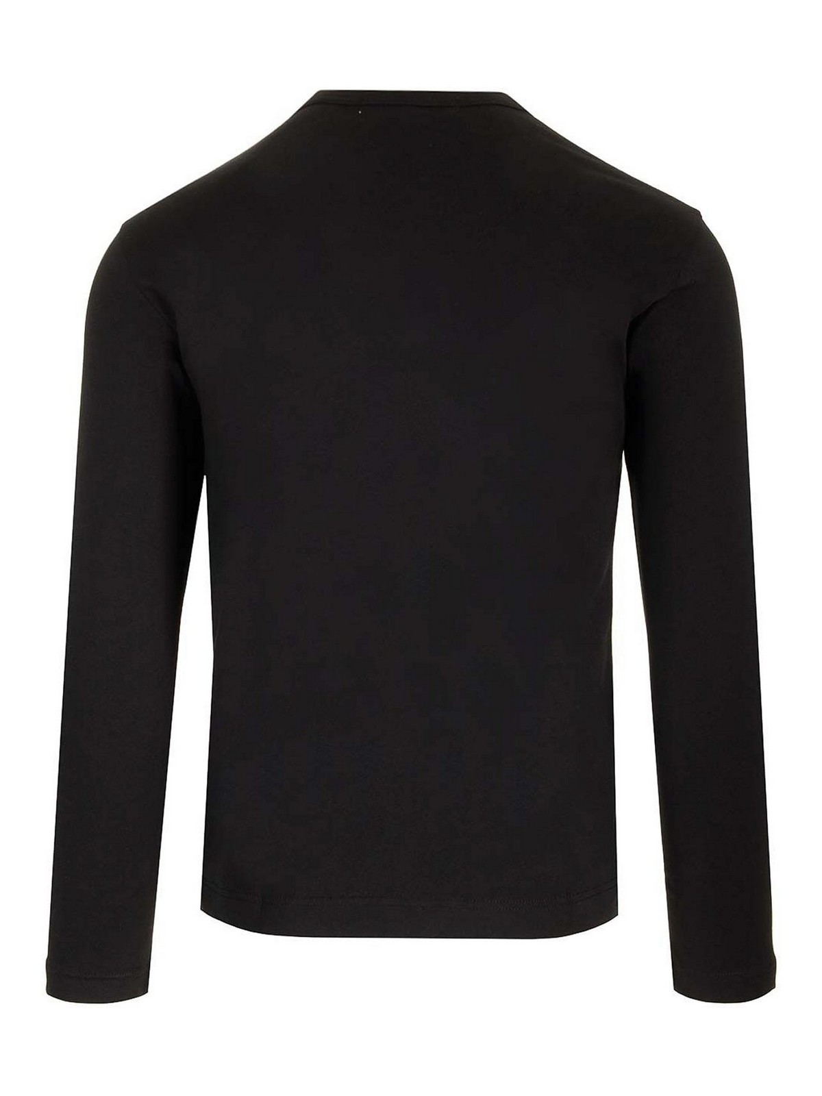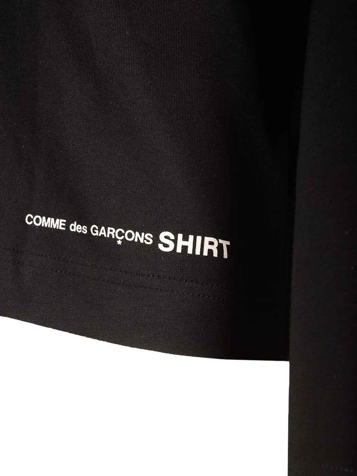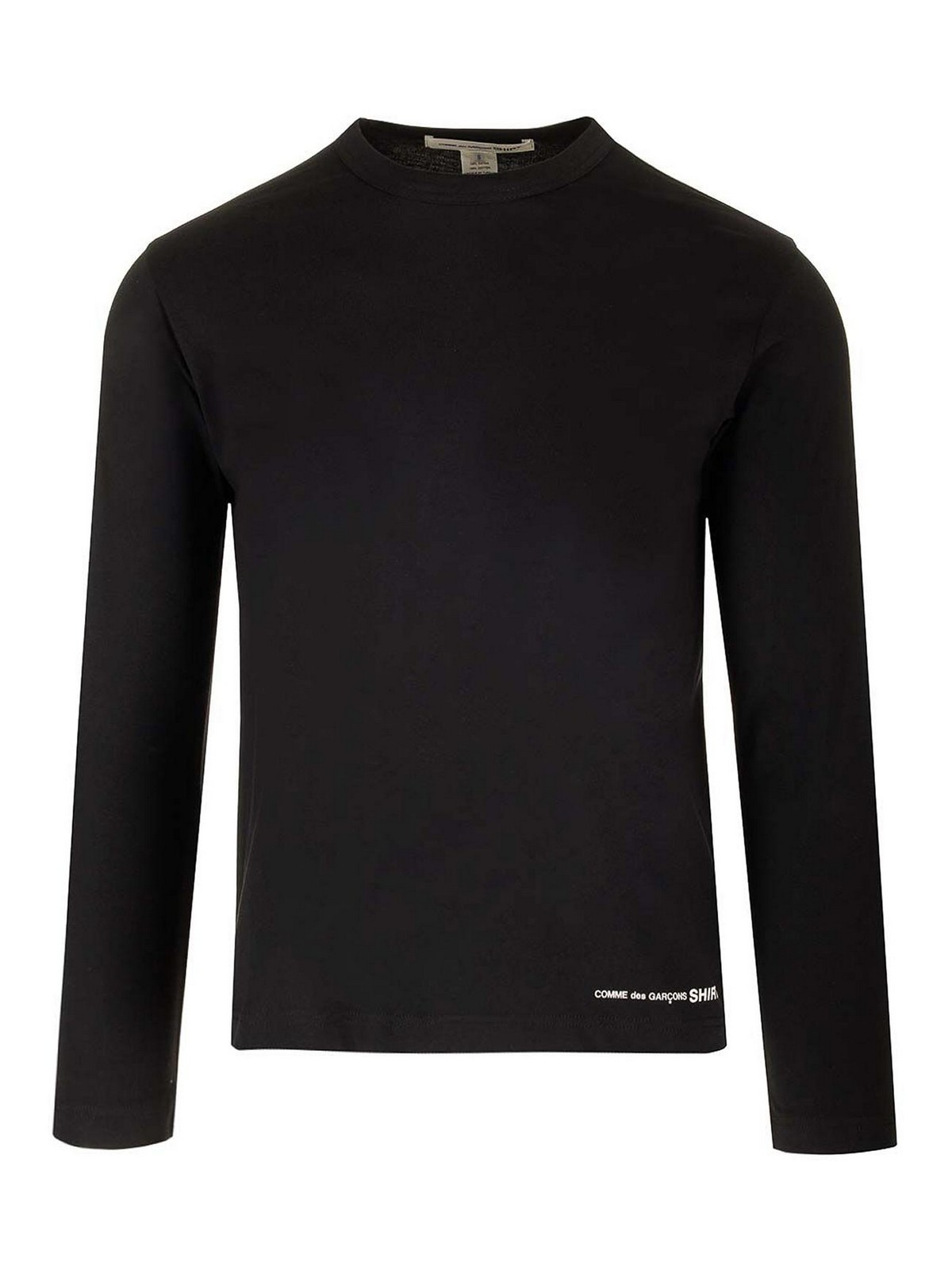 Camisa negra de comme des garcons en algodón, logo blanco estampado en la parte delantera en la parte inferior, manga larga, cuello redondo.