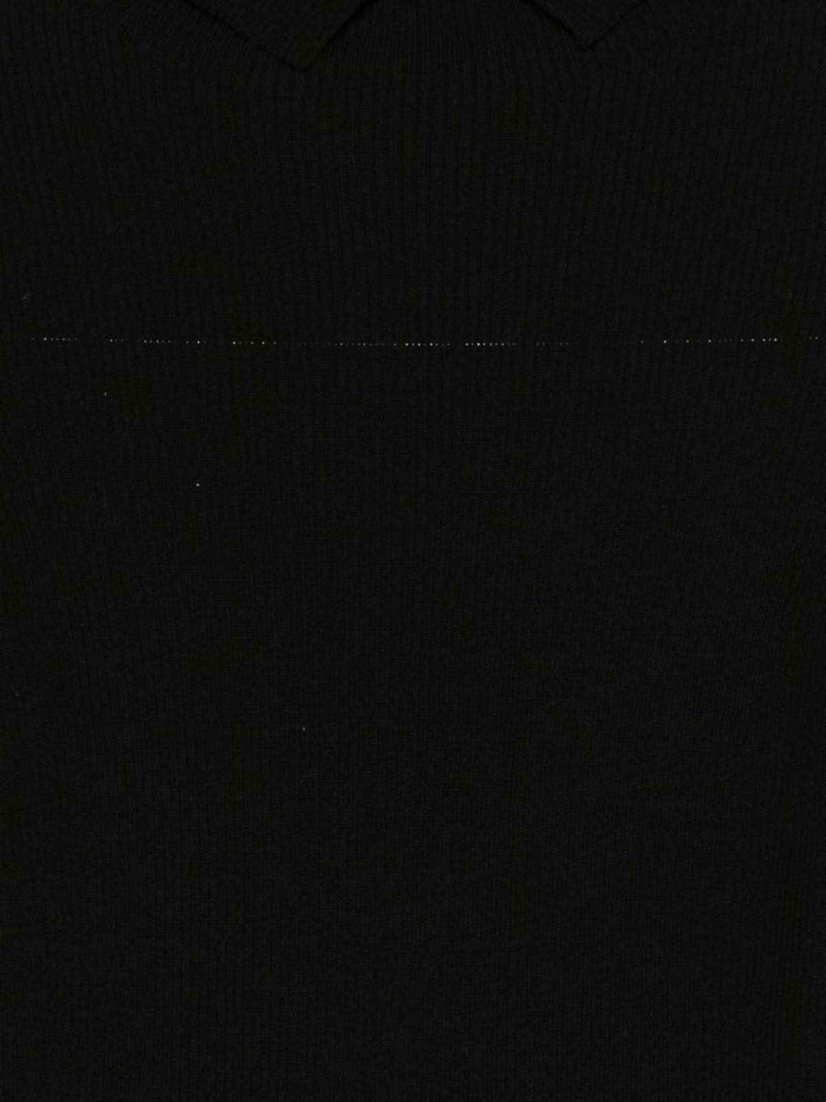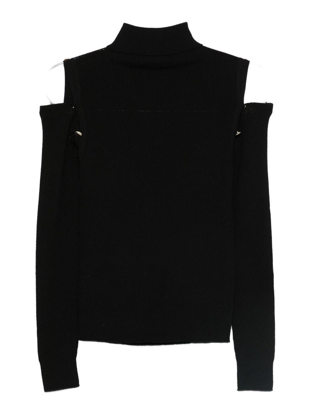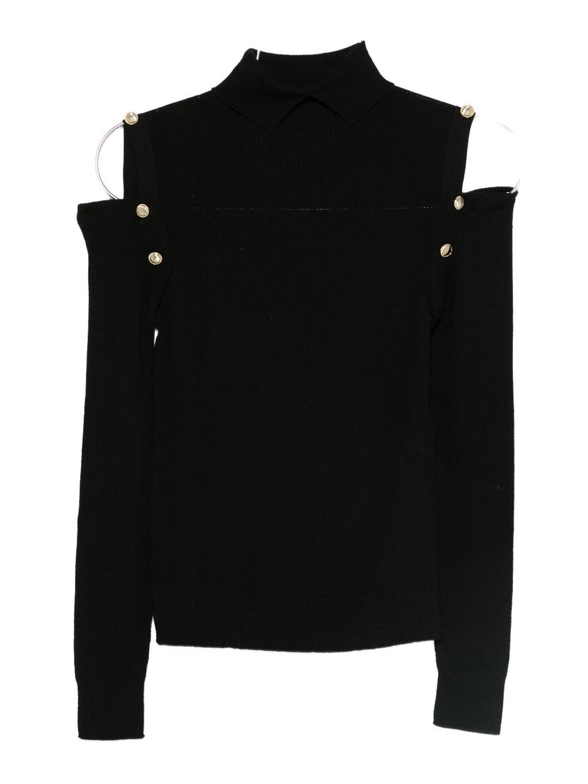 Mangas largas de punto acanalado negro con cuello alto, hombros descubiertos, adorno de botones