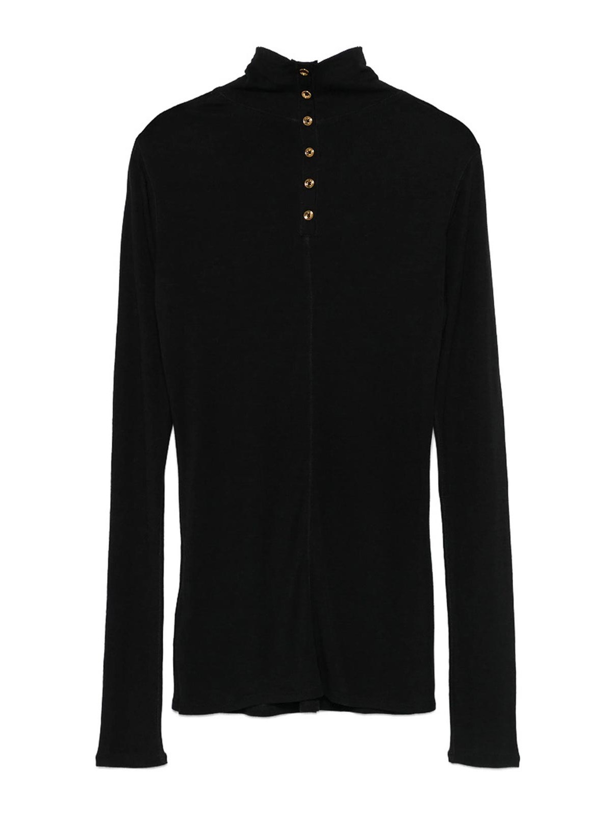 Cuello alto negro, mangas largas, costuras sutiles, dobladillo recto