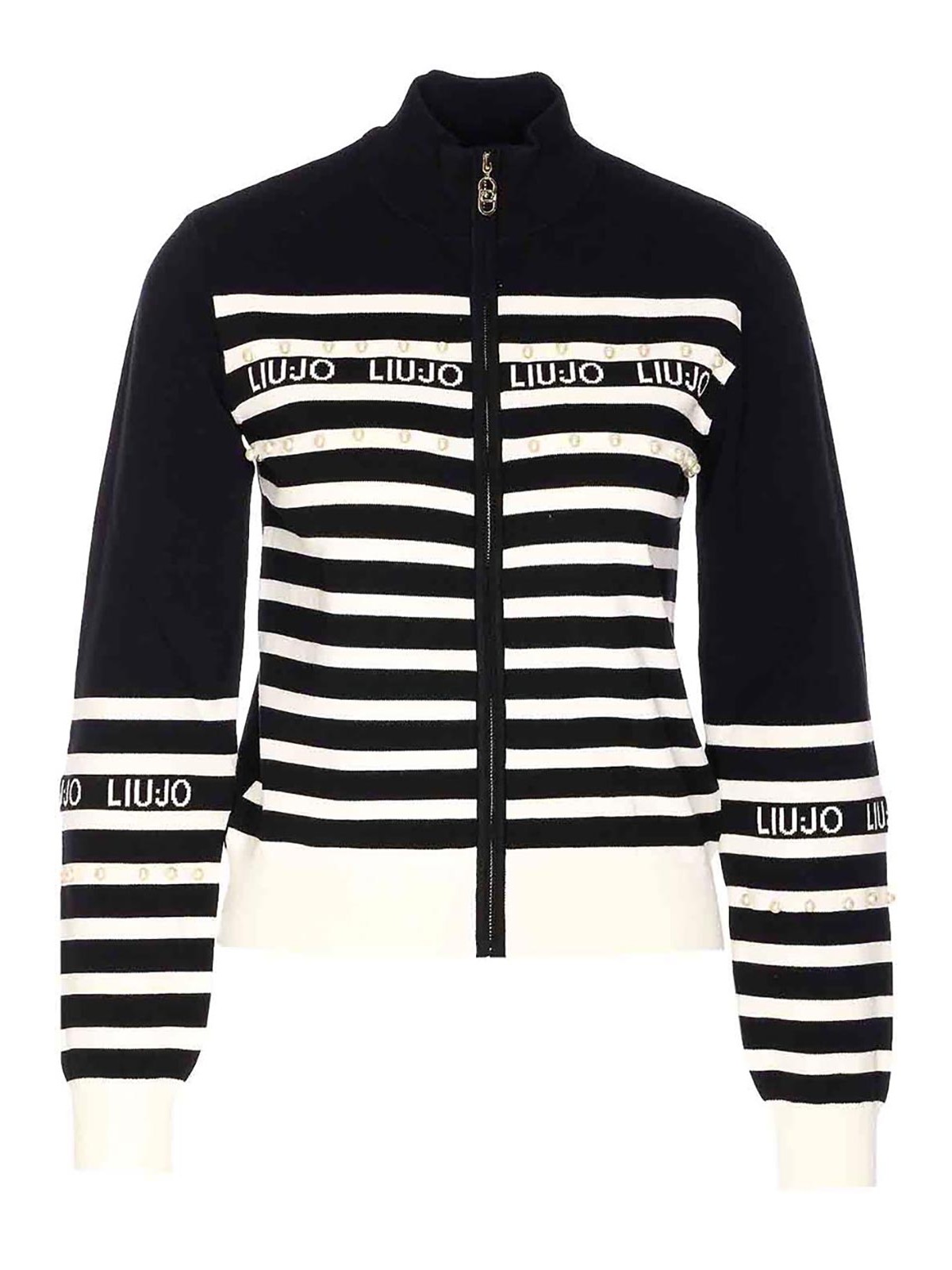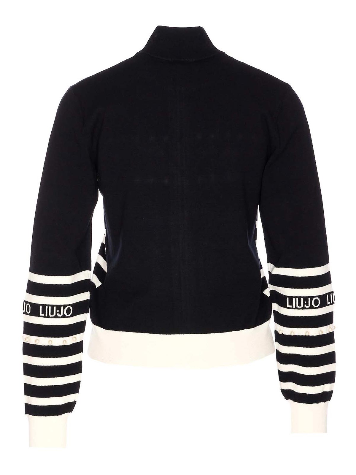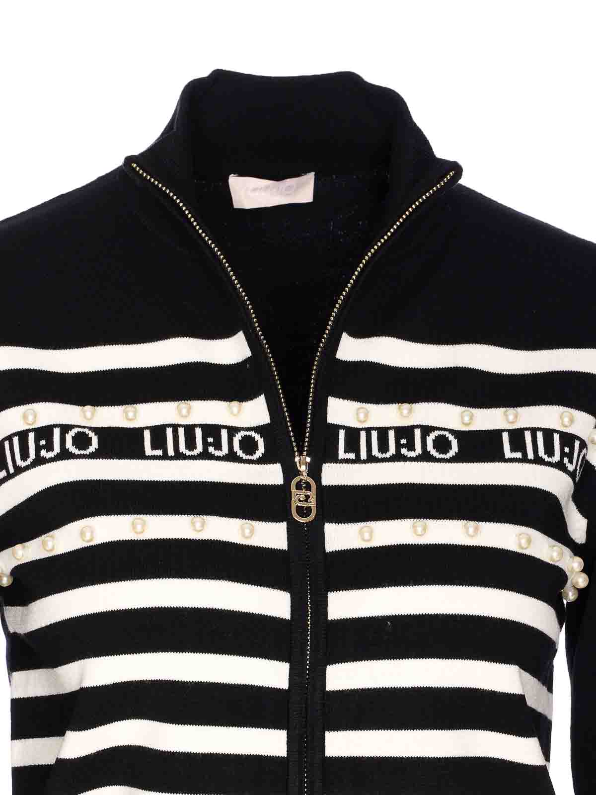 Jersey negro Liu jo con cremallera en el cuello alto, manga larga, perlas, logotipo bordado a rayas en las mangas