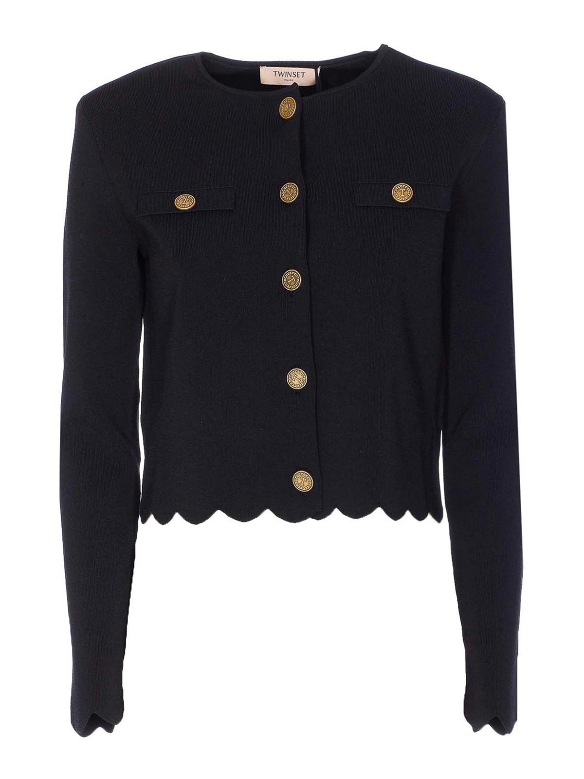 Chaqueta negra Twinset con cierre de botones, manga larga, hombro reforzado, cuello redondo