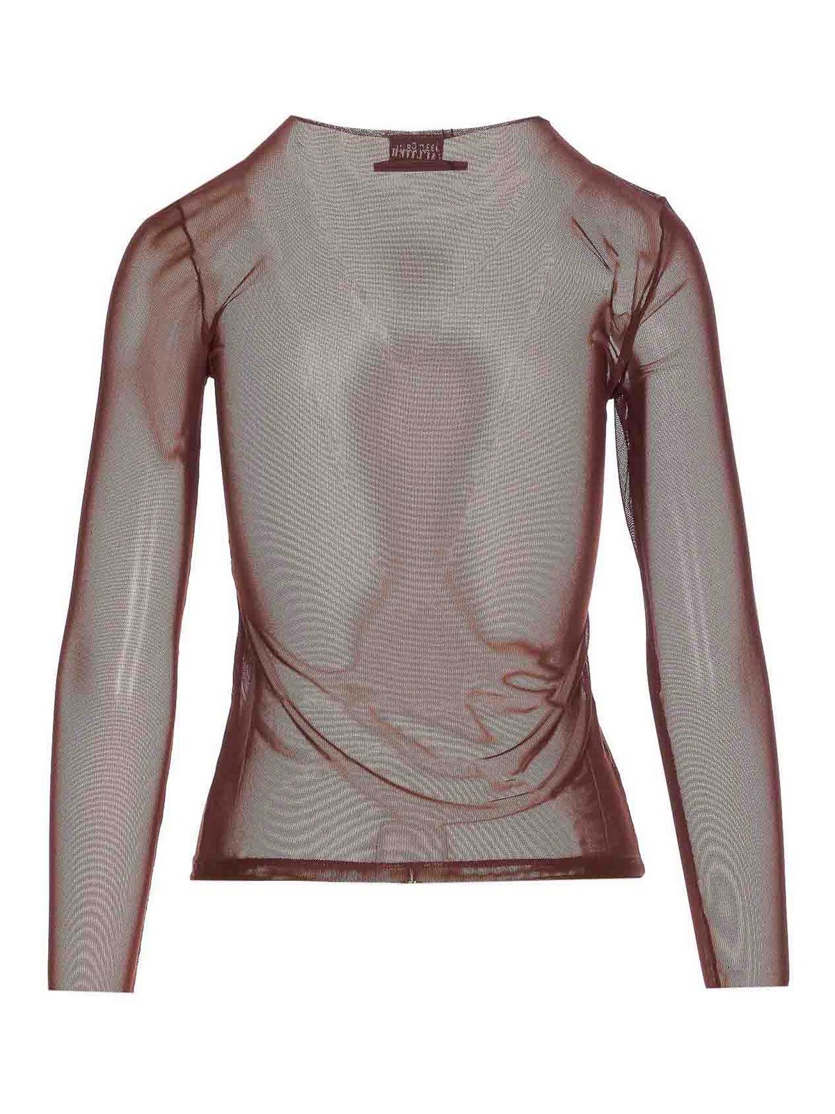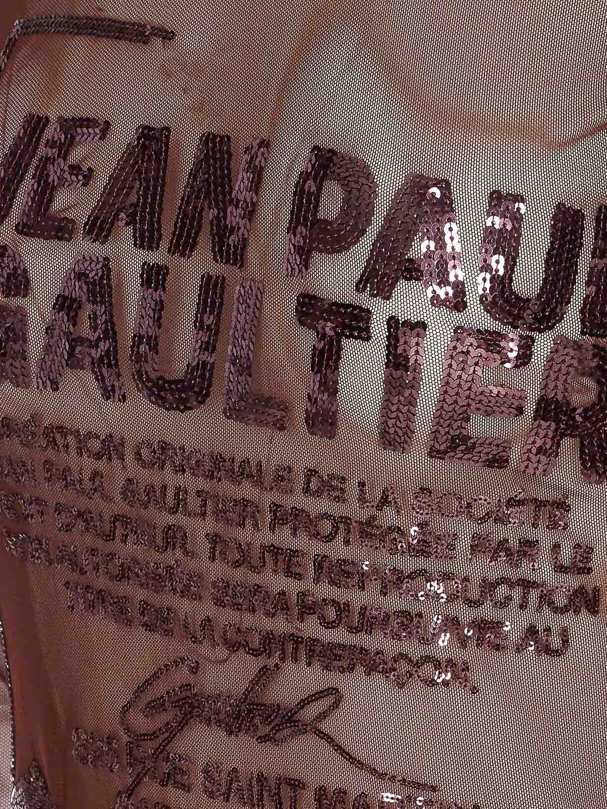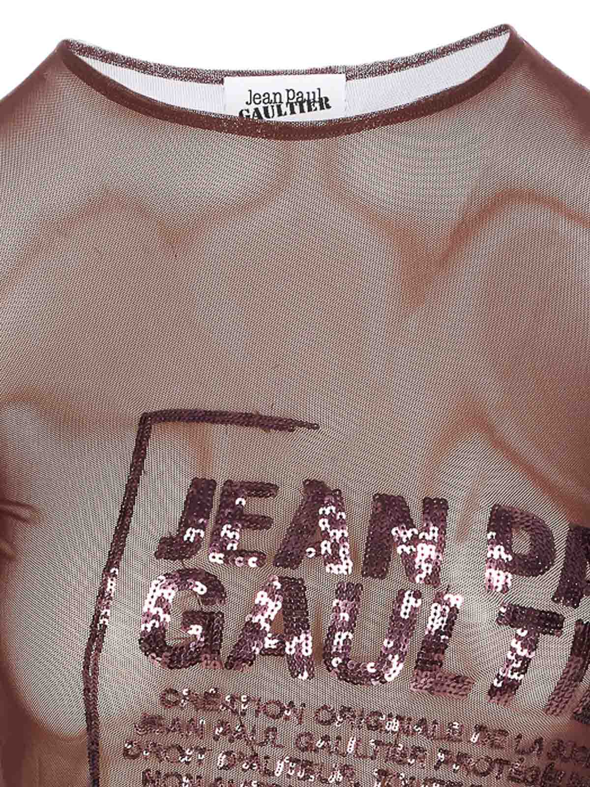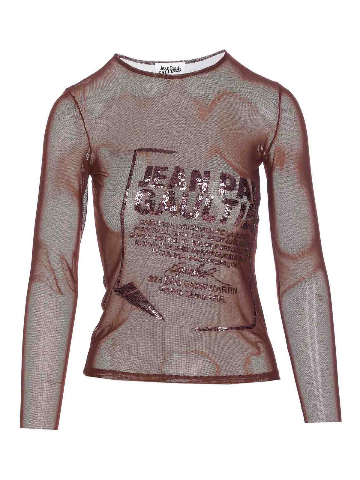 Jersey de malla burdeos con cuello redondo y cuello redondo de Jean Paul Gaultier, manga larga, logotipo de lentejuelas en la parte transparente Nombre del color del diseñador: rojo