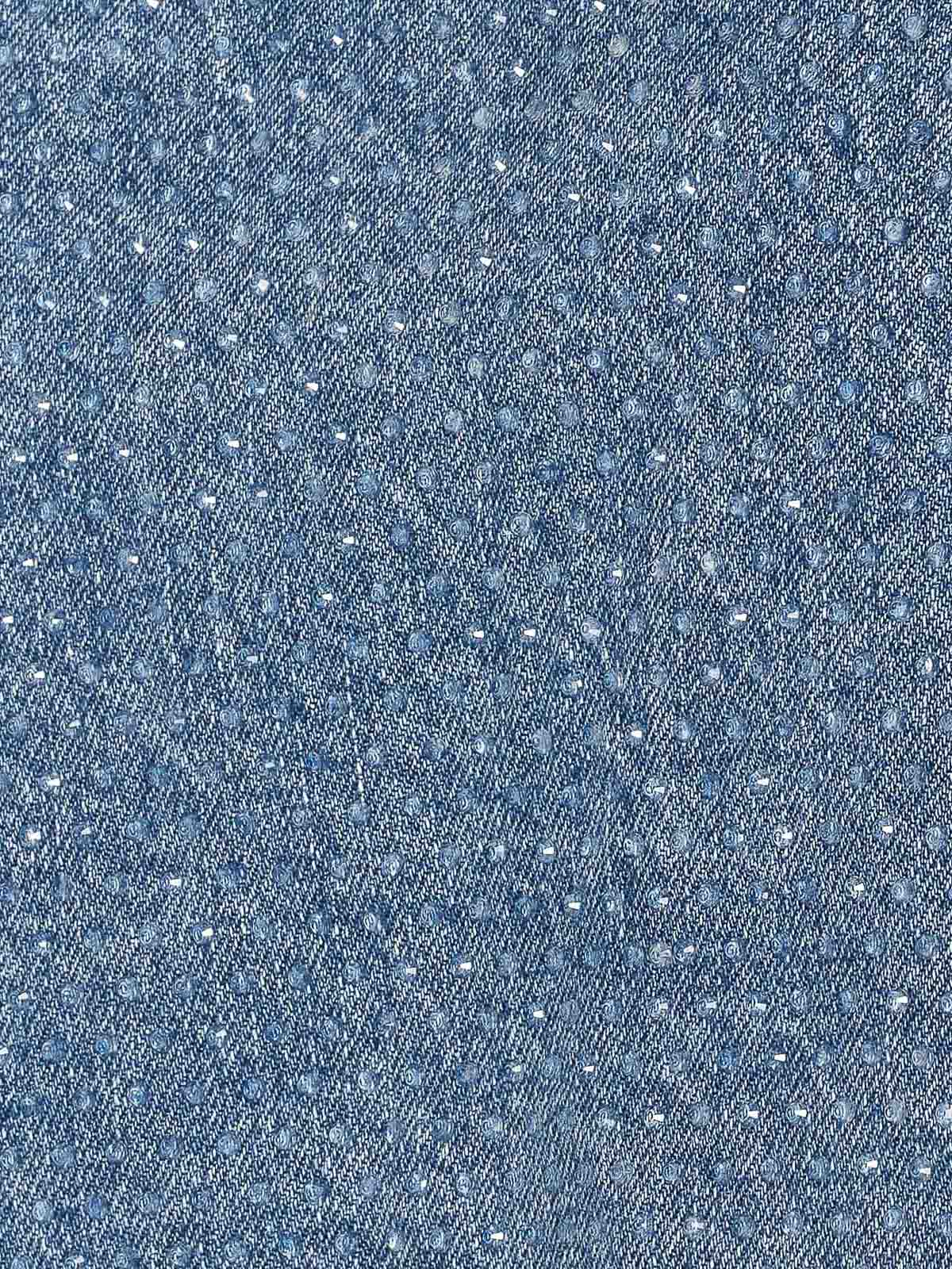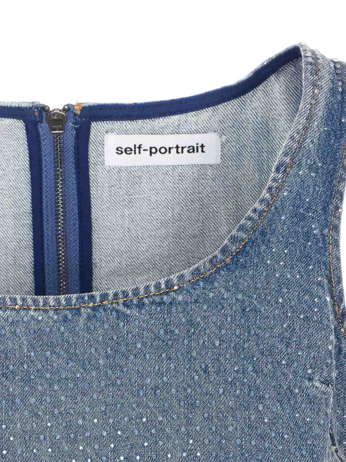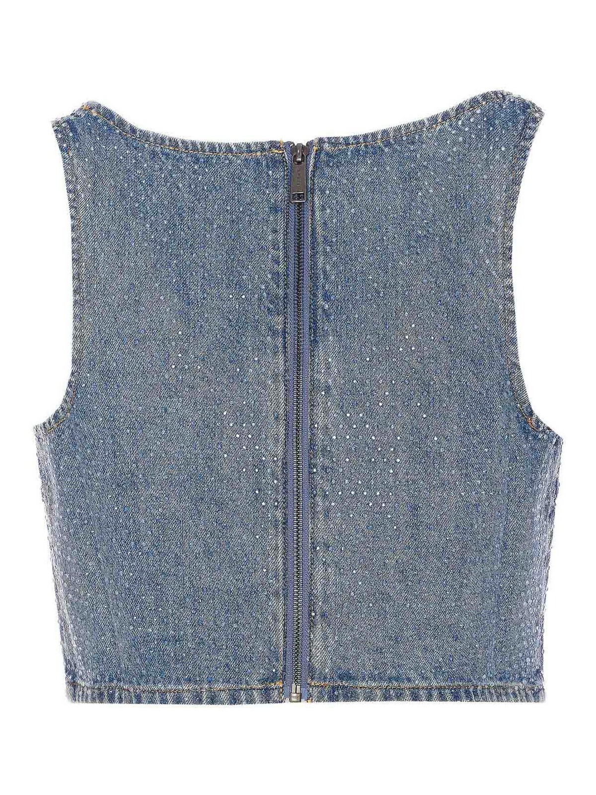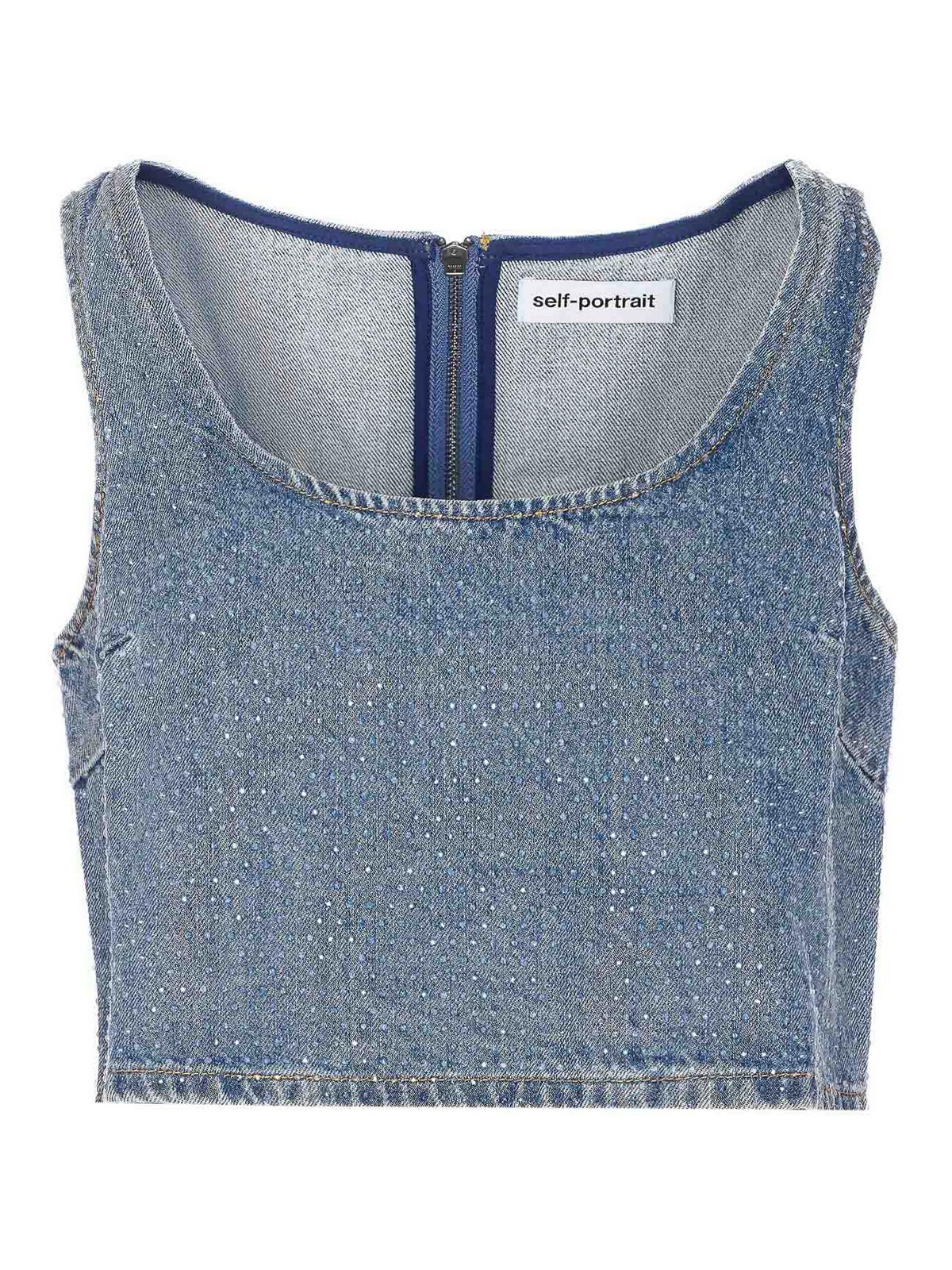 Top de mezclilla azul con strass autorretrato, cierre con cremallera en la parte posterior, detalles de strass en toda la prenda, sin mangas