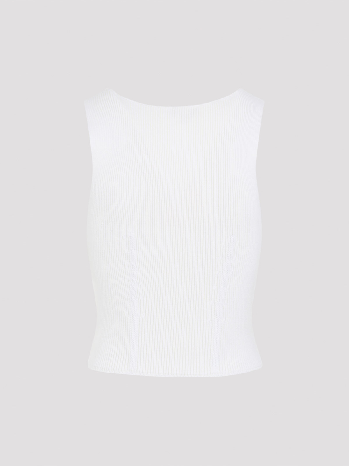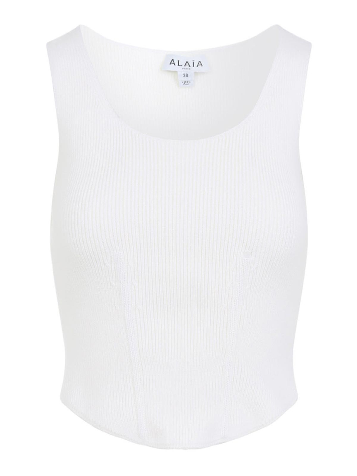 Top de lana blanca con corsé Alaa. La camiseta presenta un diseño de corsé con deshuesado integrado, confeccionada en lana acanalada blanca, cuello redondo, diseño sin mangas y dobladillo curvo.