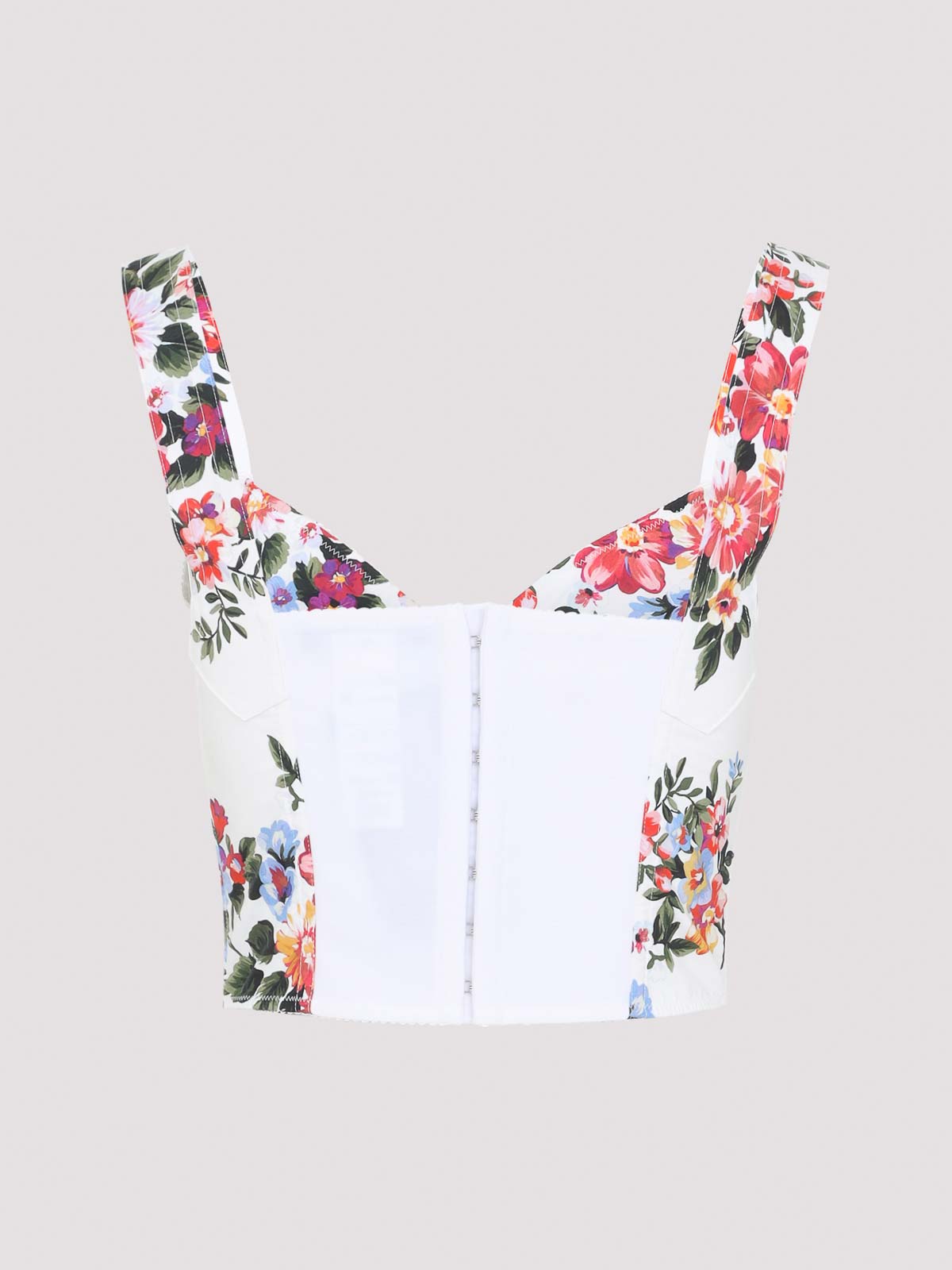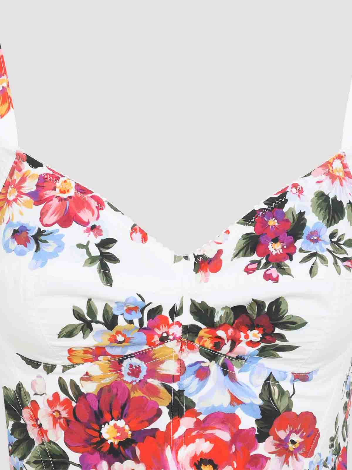 Top de algodón blanco de Dolce & gabbana. Confeccionado en algodón elástico blanco con un estampado floral en toda la prenda, con un escote corazón, confección sin mangas, copa de sujetador preformada, cierre de gancho oculto en la espalda y un largo corto.