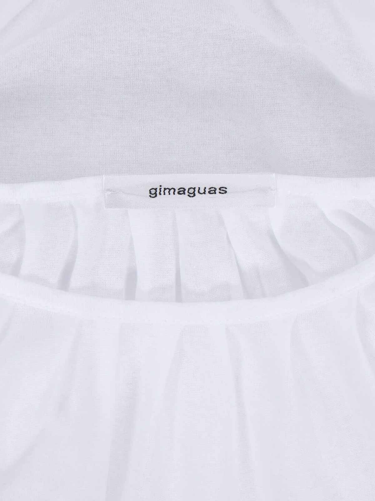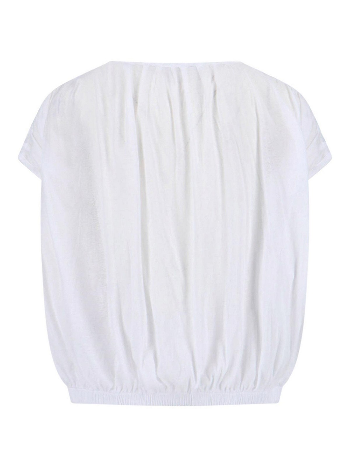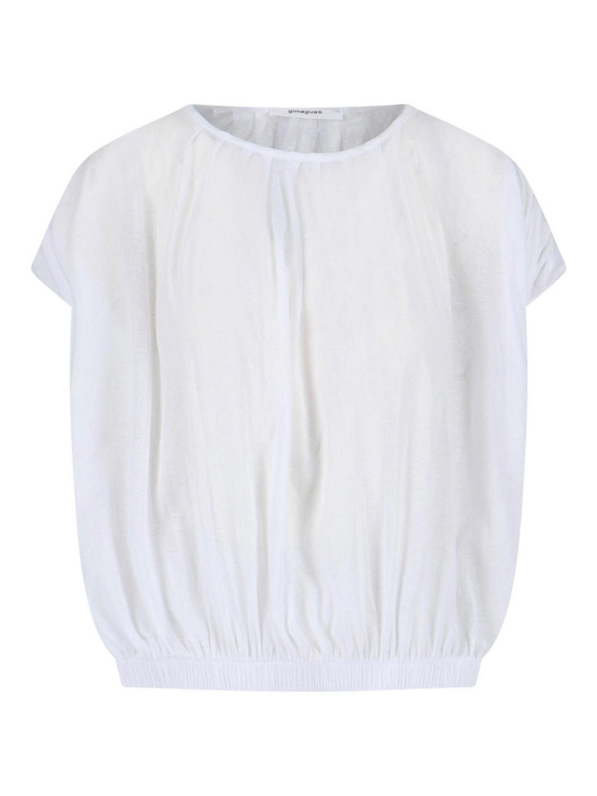 Top tipo oni Gimaguas en algodón blanco, cuello redondo, manga corta, diseño fruncido, dobladillo recto elástico.