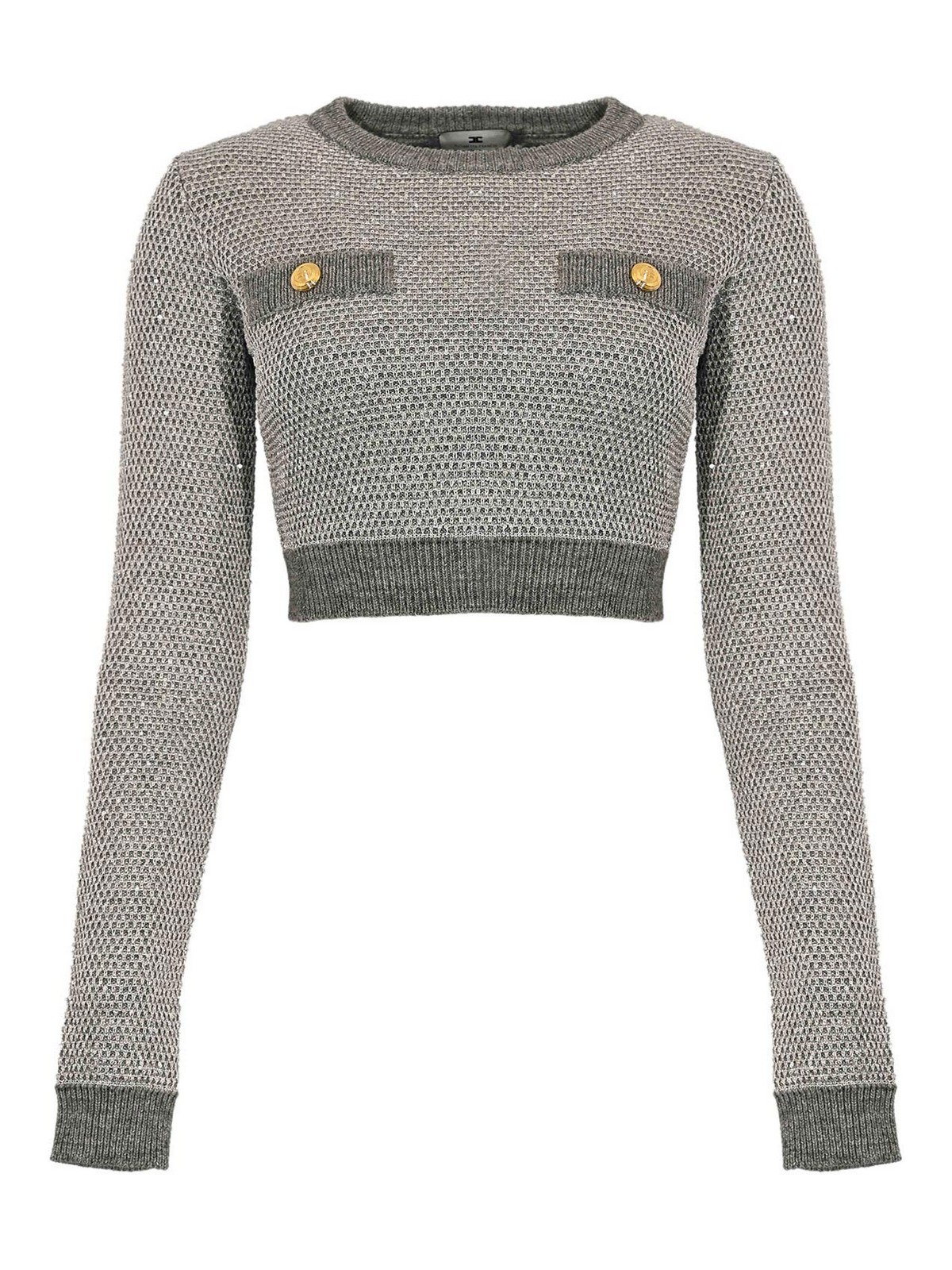 Mezcla con punto fino y estampado de lentejuelas, mangas lisas con efecto brillante, cuello largo, cuello redondo acanalado, sin bolsillos, solapas sintéticas decorativas con botones, estilo recortado, punto en panal de abeja, ribete acanalado en el cuello, puños y dobladillo, logotipo, botones forrados, sin ajuste