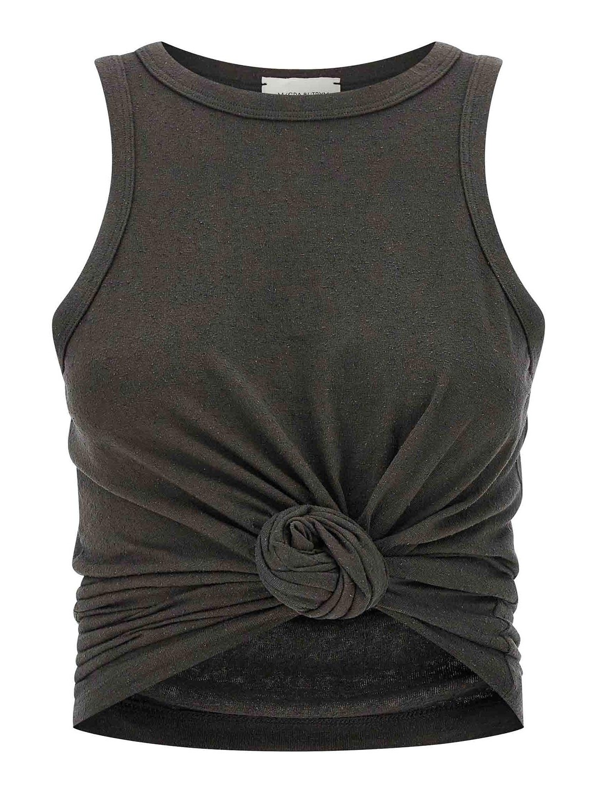 Camiseta sin mangas de algodón y seda de 02 pies con textura cruda, cuello redondo y detalle de nudo en la parte delantera.