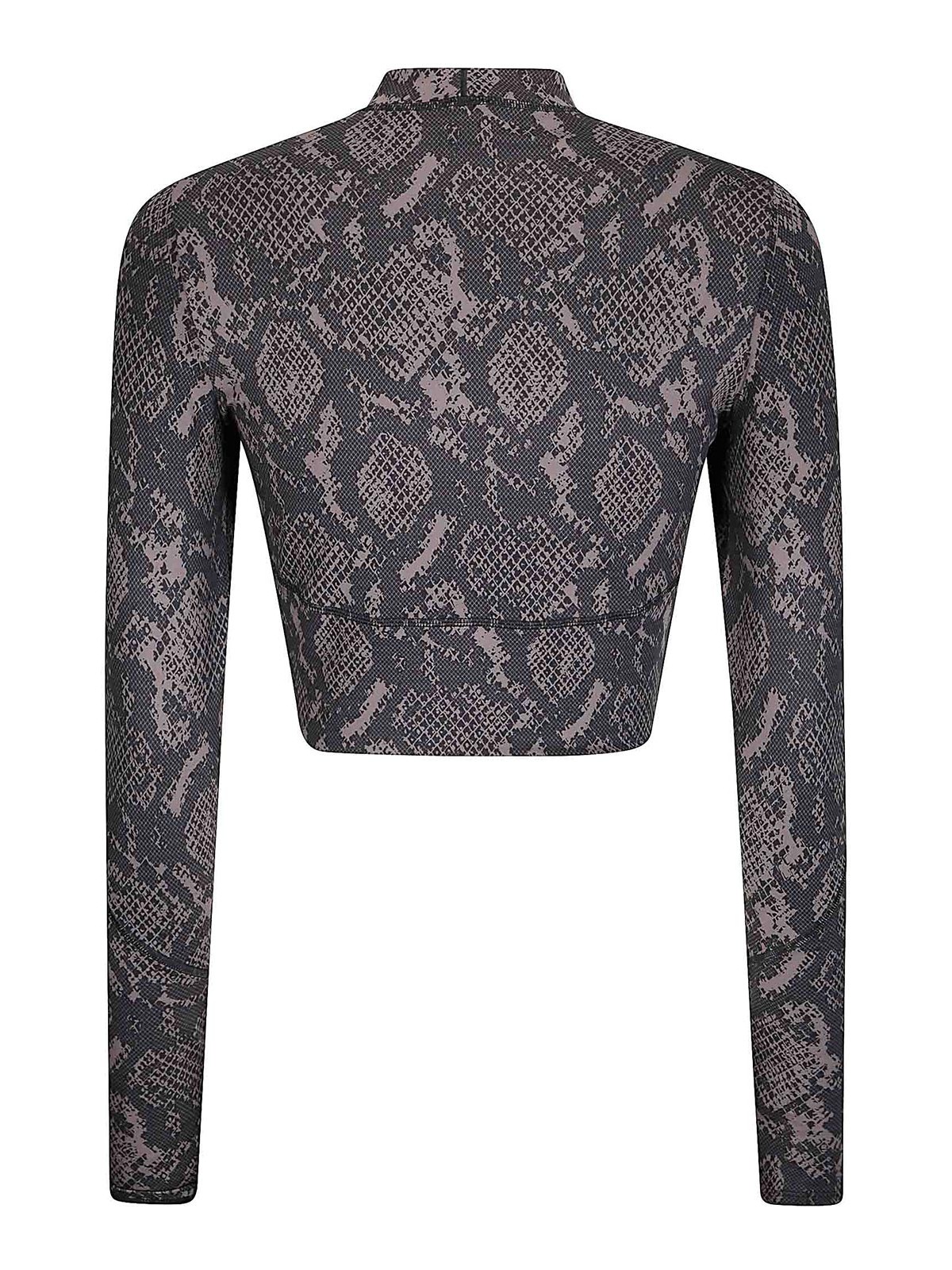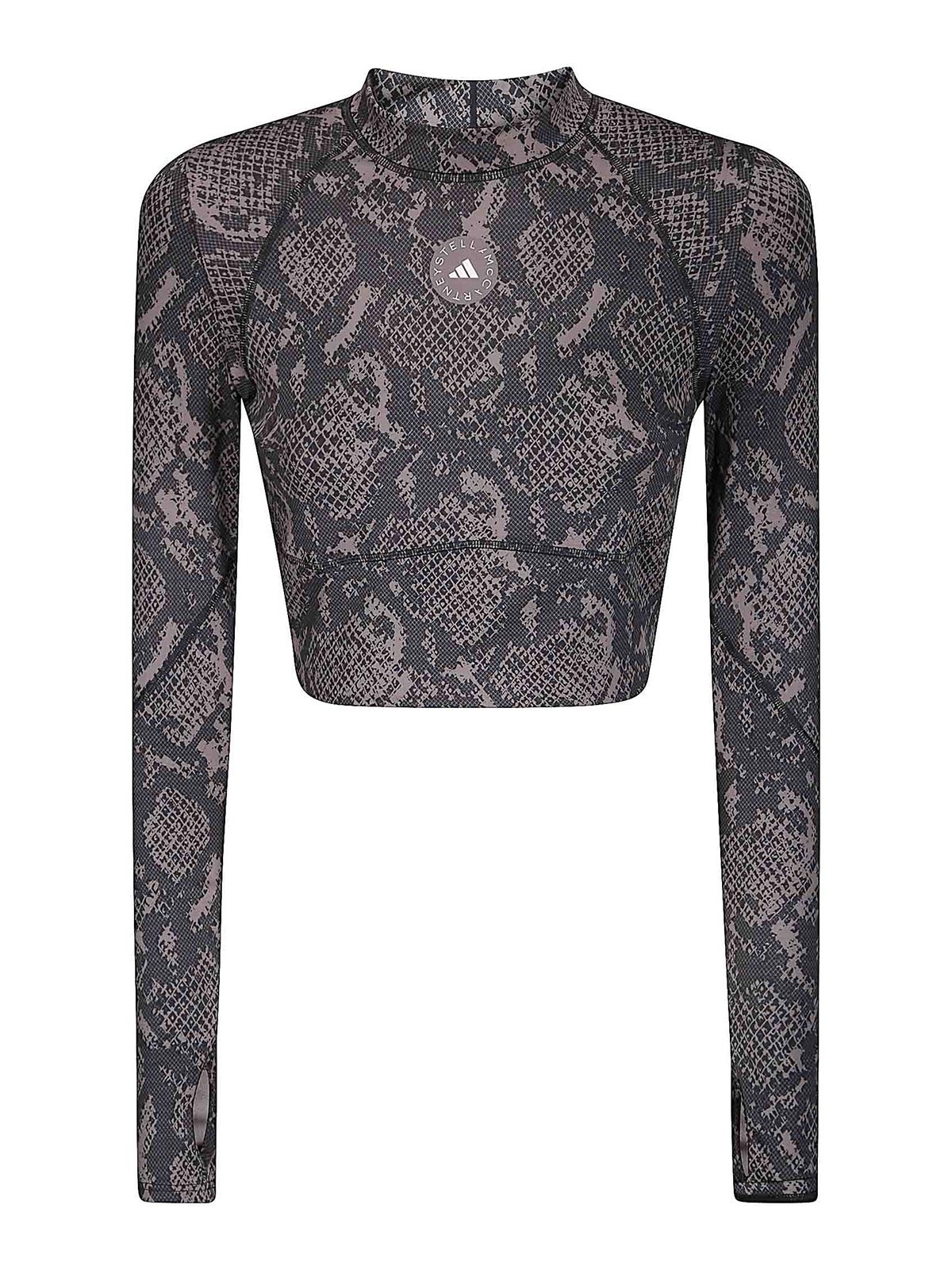 Top corto en corte ajustado, estampado con teléfono técnico, muestra de cosidas con barra para el pulgar
