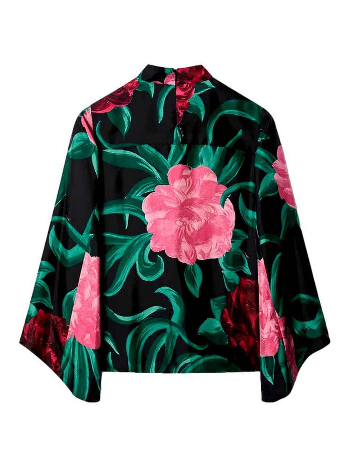 color del diseñador: peonía, seda, motivo floral, cuello alto, forma evasé, mangas largas anchas, dobladillo alto-bajo.