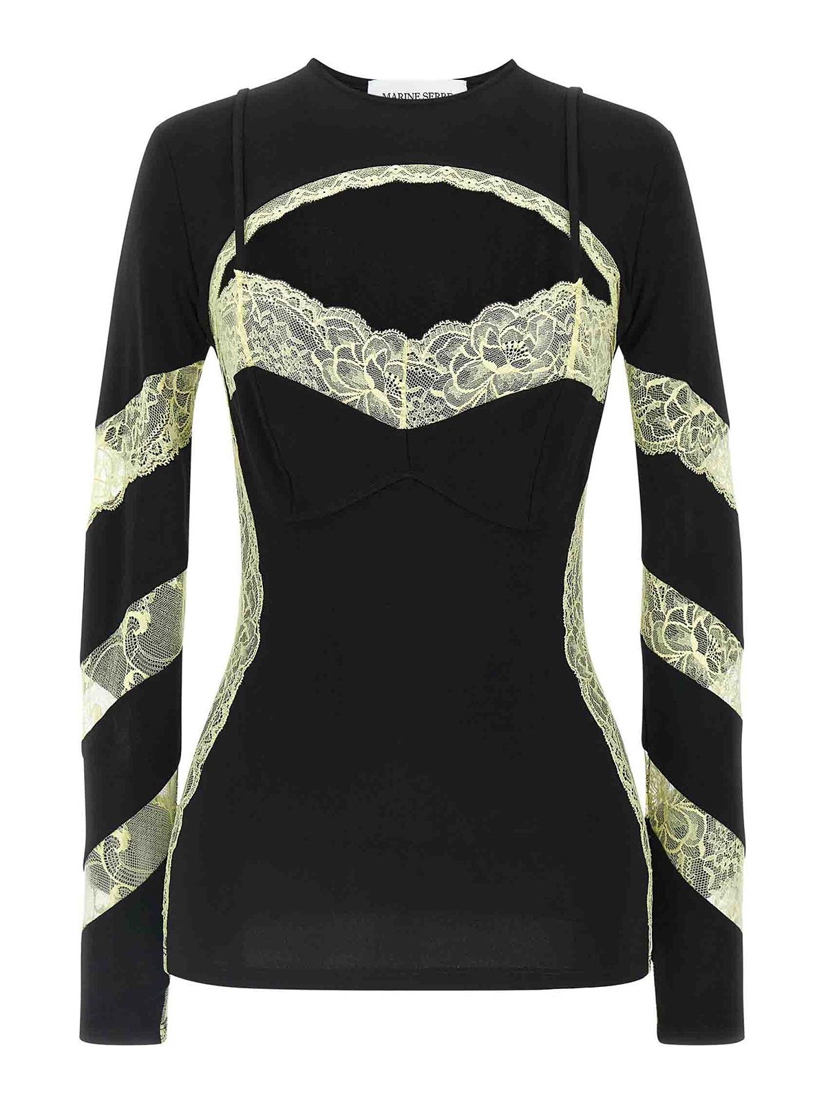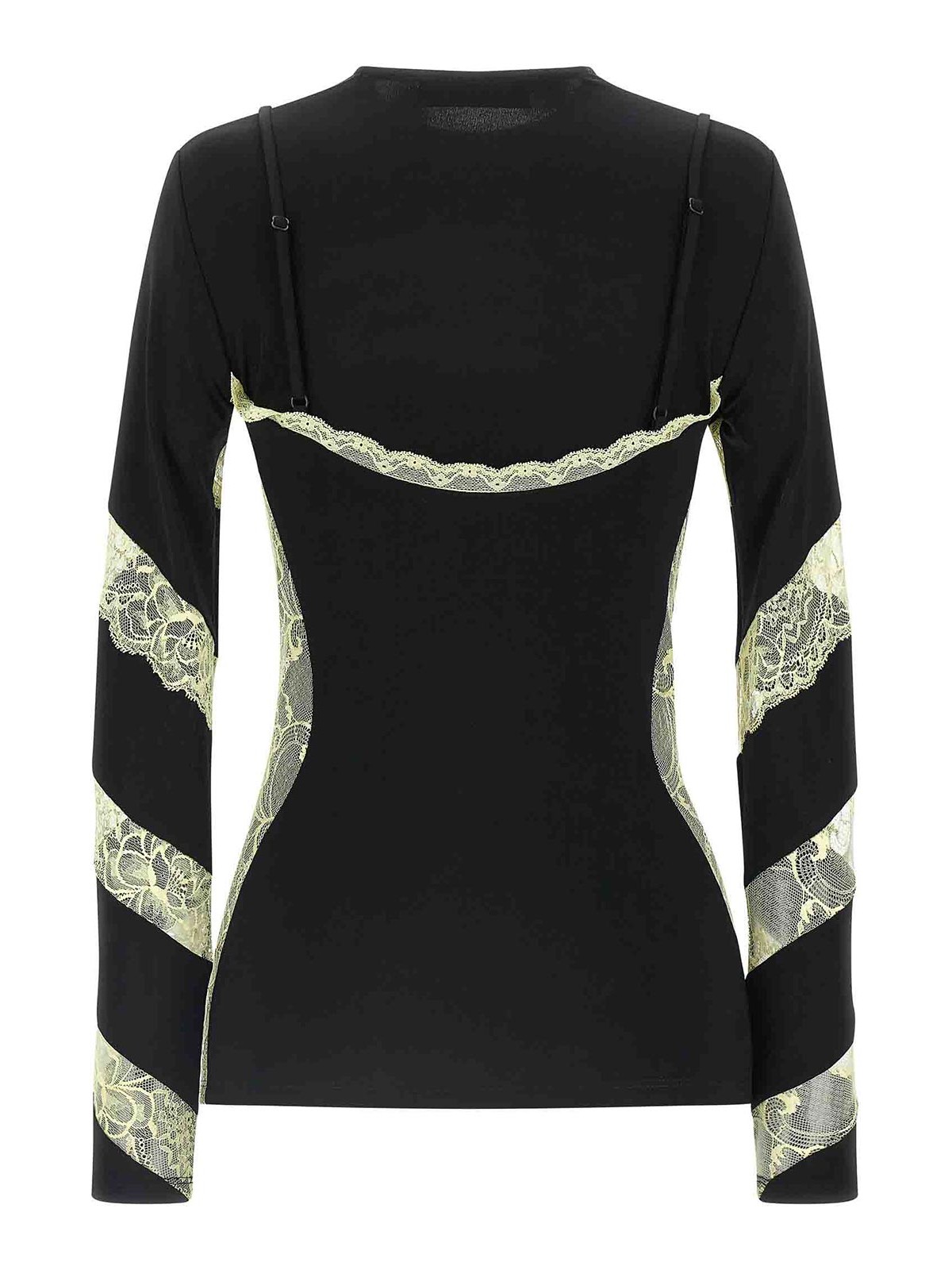 Top de viscosa elástica con inserciones de encaje, modelo trompe l'oeil con detalle de abertura en la parte delantera, tirantes finos, cuello redondo y mangas largas.