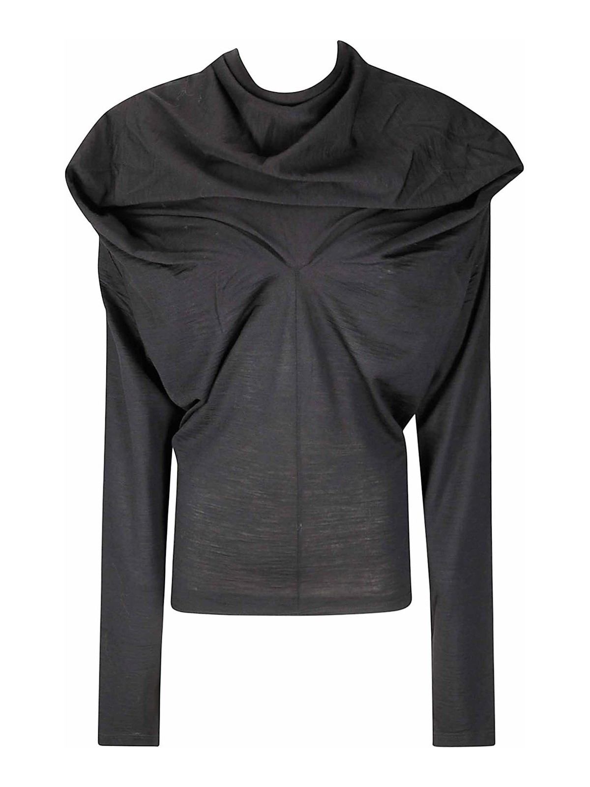 Camiseta de manga larga con detalles fruncidos, corte ajustado, tejido de lana ligera.