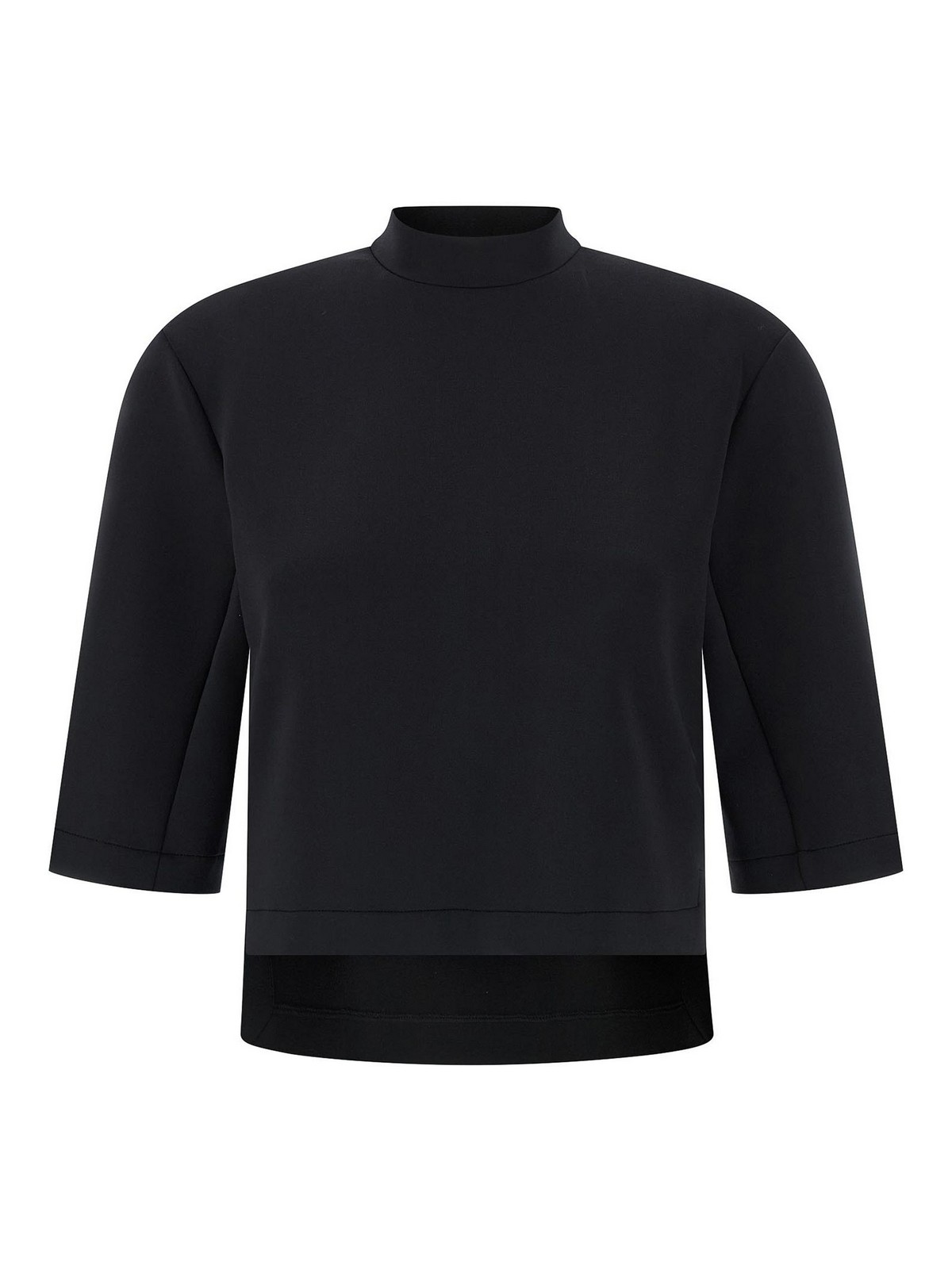Top Moncler x Edward Enninful en tejido con efecto buceo, modelo corto, cuello alto con parche del logotipo tono sobre tono en la espalda, mangas cortas, aberturas laterales y dobladillo asimétrico.