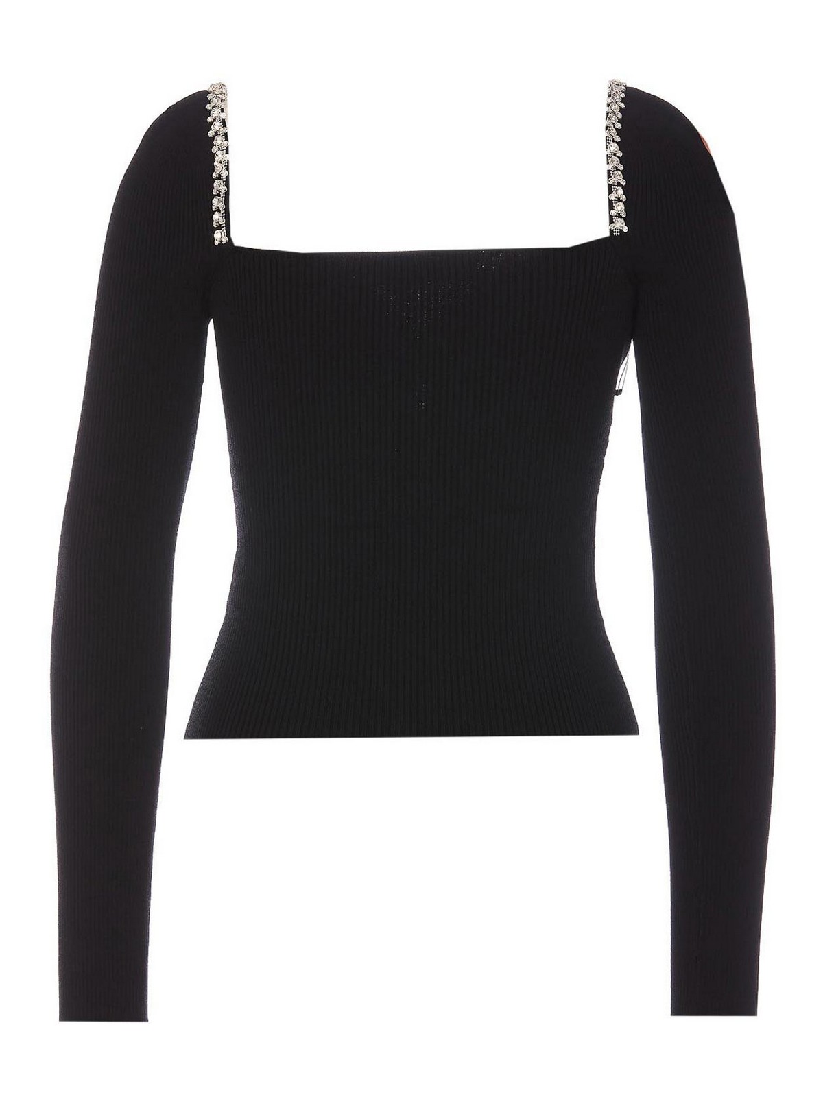 Top de autorretrato de punto negro con diamantes, cuello en forma de corazón, mangas en L, detalles de cristales, elástico y ajuste ajustado