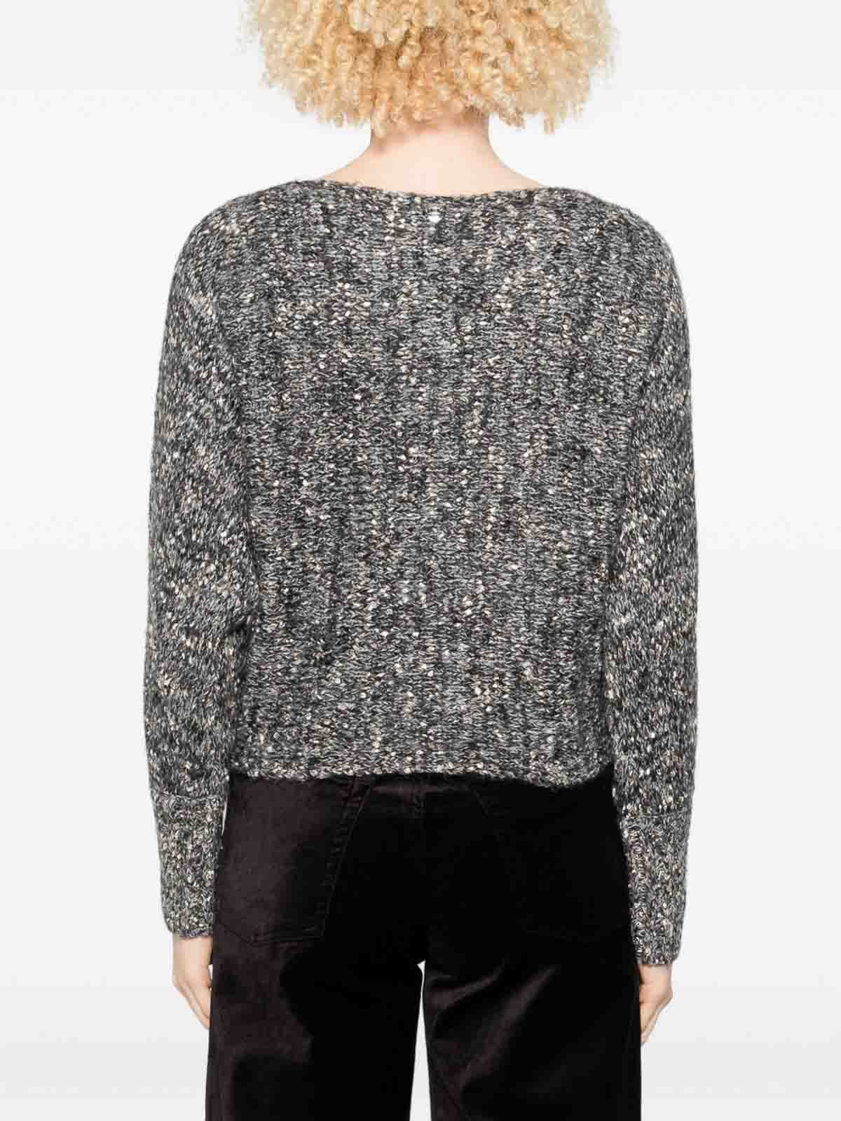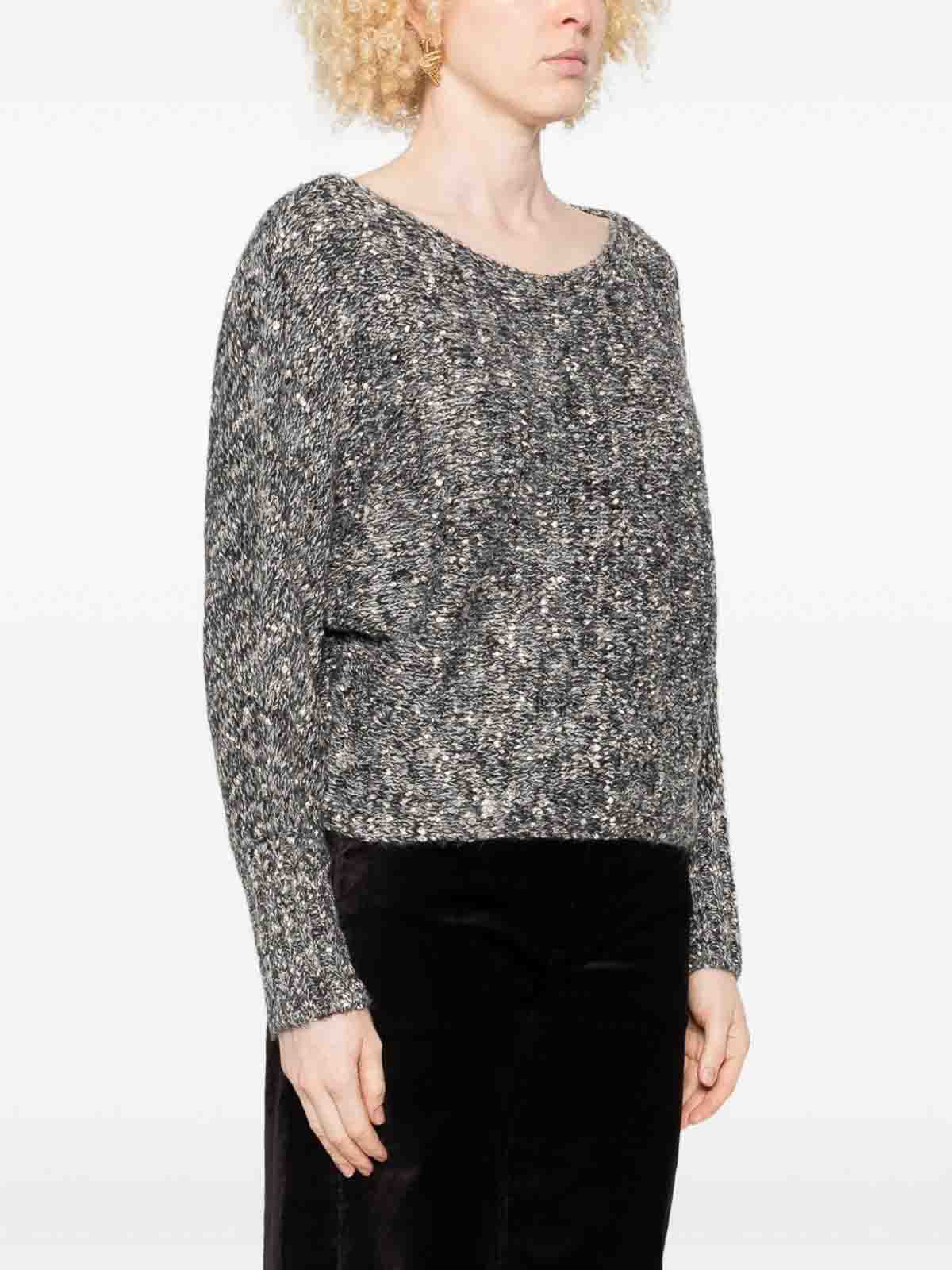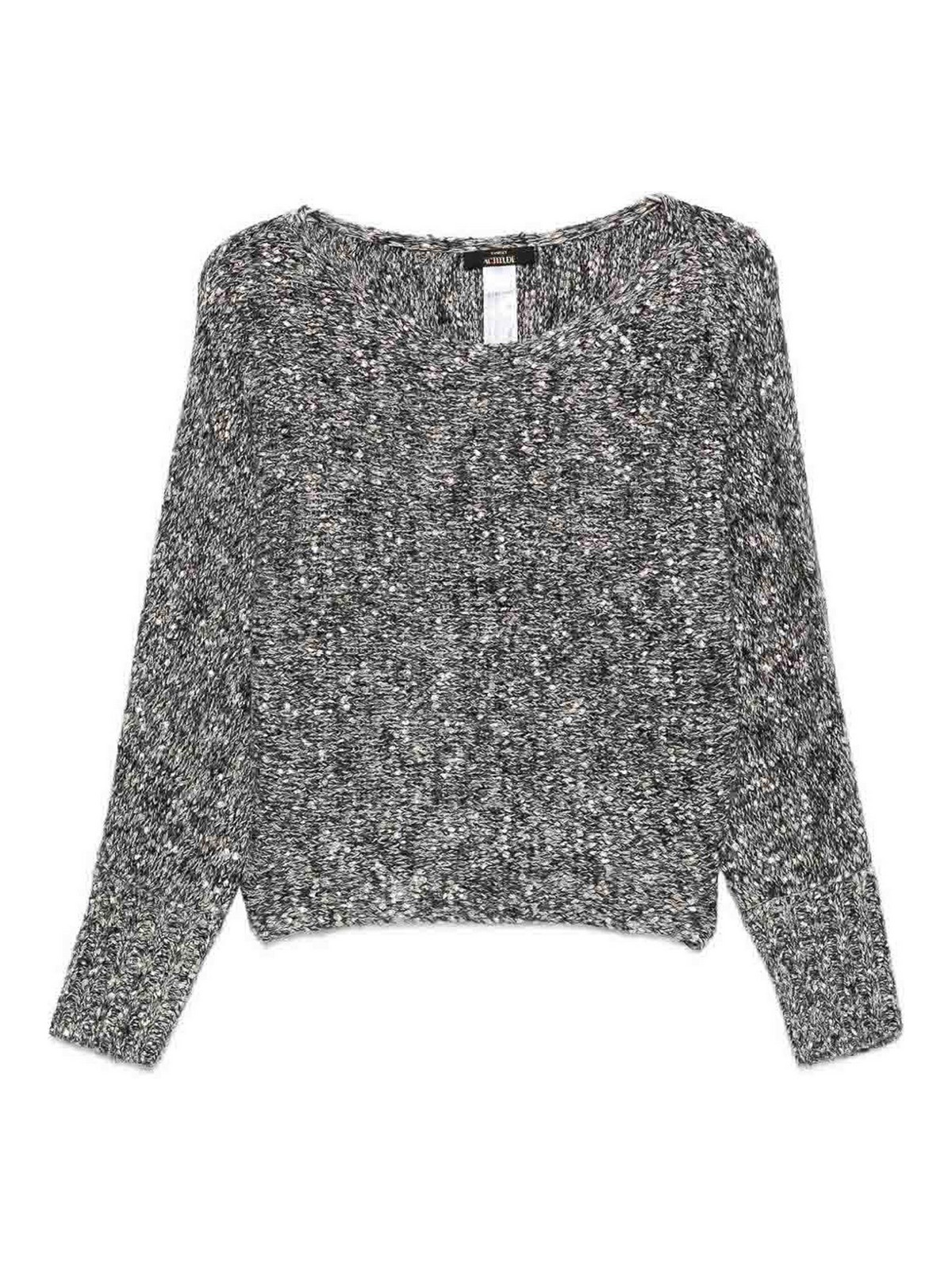 Cuello redondo con estampado moteado negro, mangas largas, puños acanalados