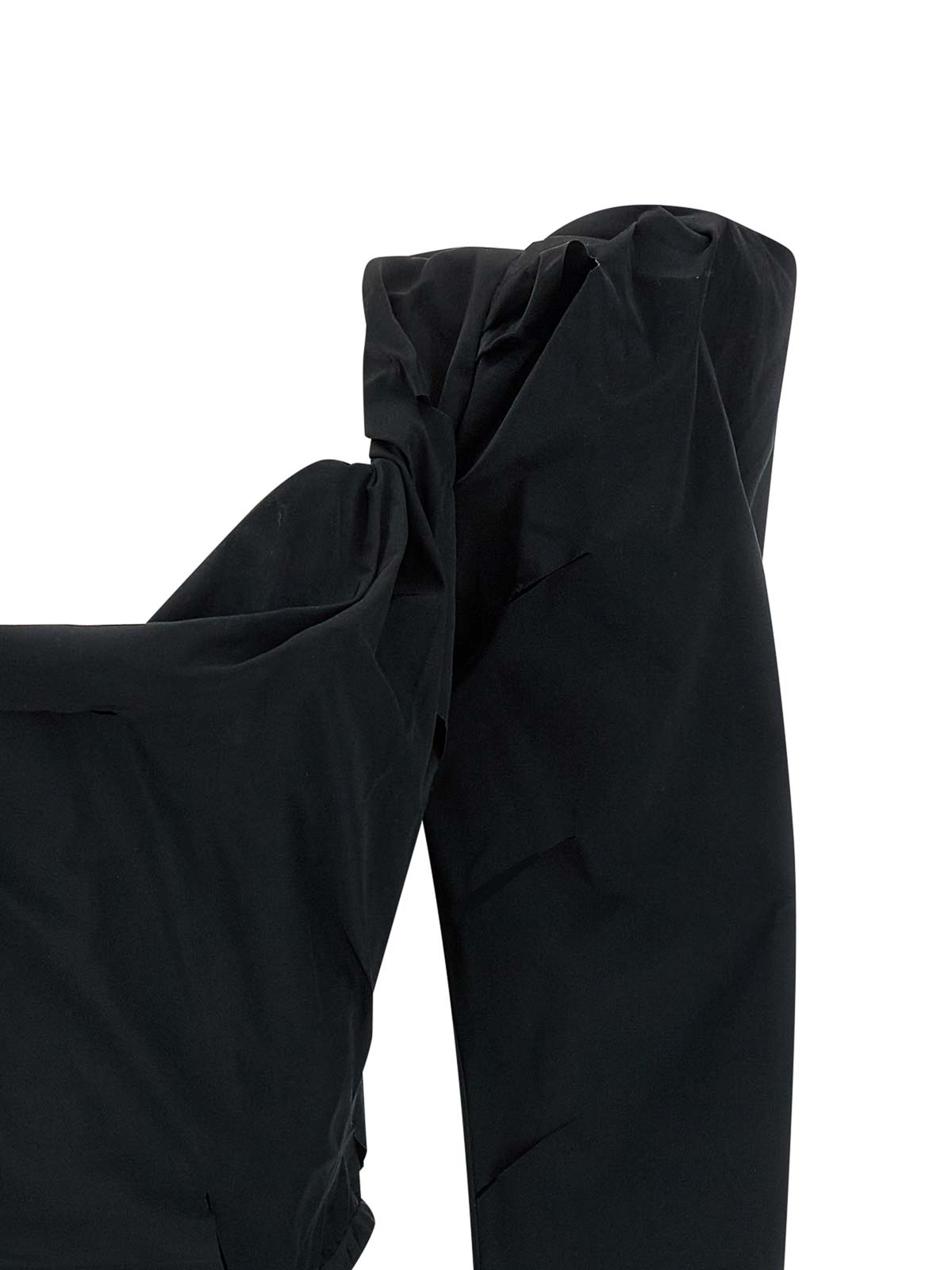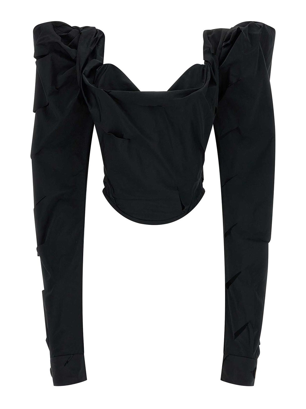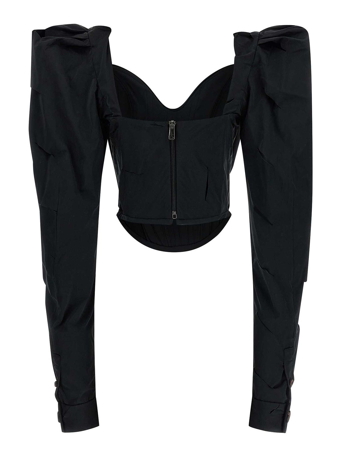 Top integral de tafetán cortado con láser de ls sunday corset, modelo corto, silueta escultural de corsé con férulas rígidas, escote delantero en forma de corazón, escote cuadrado en la espalda, hombros anchos y abullonados con detalles rizados, mangas largas con puños, cierre trasero con cremallera, dobladillo asimétrico.
