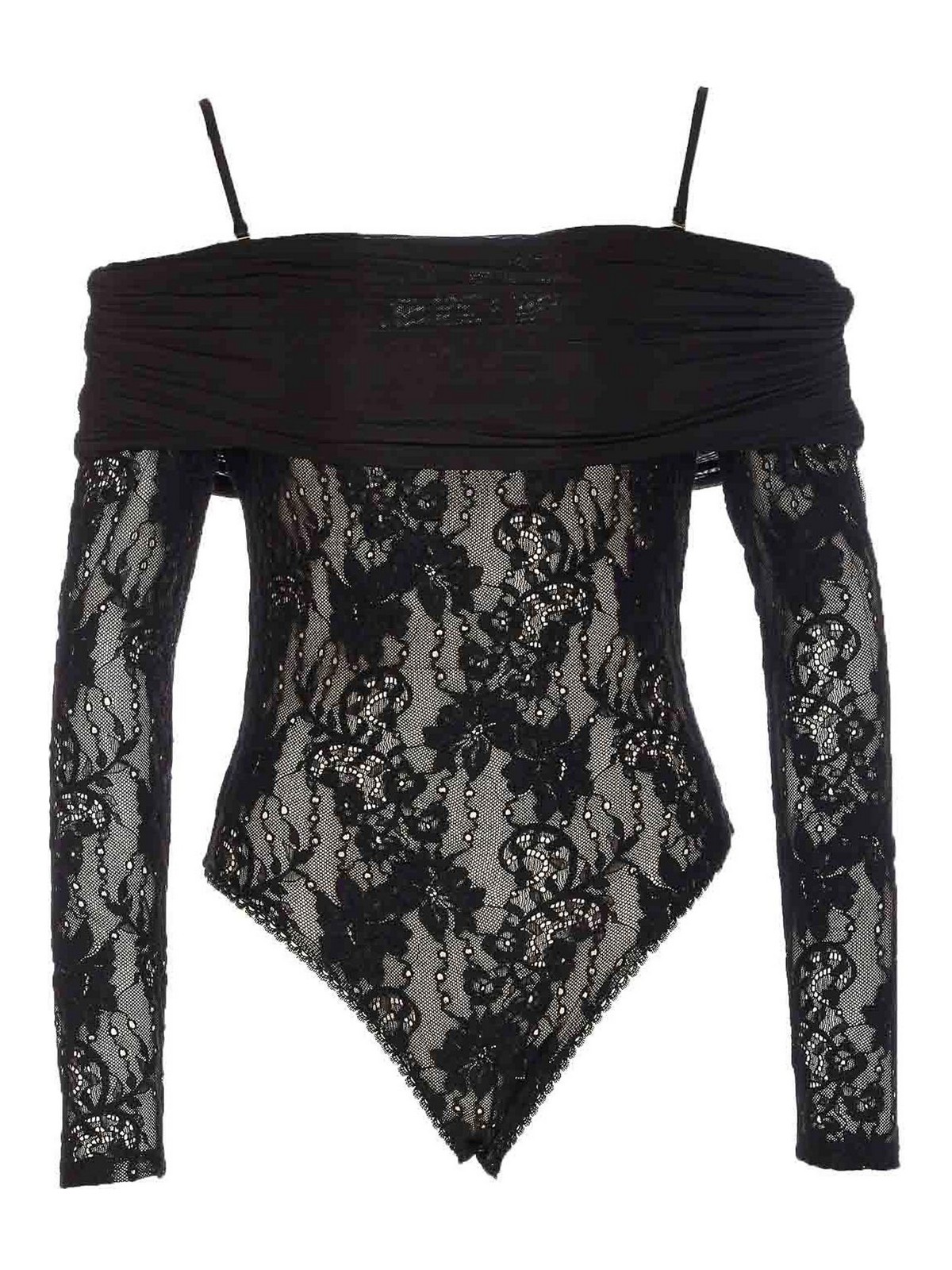 Cuerpo drapeado negro Rebellion de Zimmermann, correa de hombro ajustable, mangas largas, detalle de encaje, enagua, escote barco