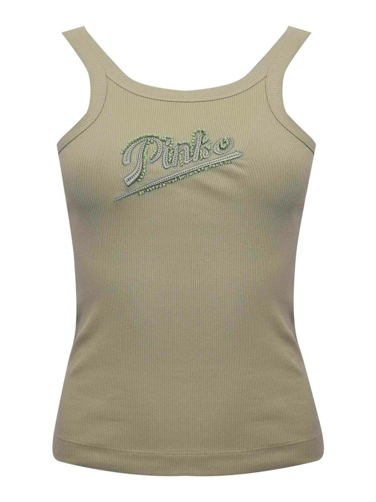 Top de algodón acanalado para mujer, modelo rosa, caipiroska, tejido: algodón acanalado, estampado: color liso, mangas: sin mangas, cuello: cuello redondo, cierre: sin cierre, bolsillos: ausentes, detalles: logotipo de pinko bordado en el pecho con abalorios, forrado: no, corte: ajustado