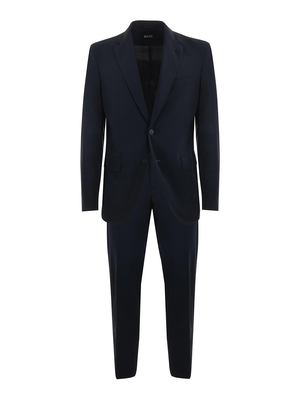 Traje de jefe en azul oscuro con tono, puesto, tono micro, estampado, chaqueta individual, botonada, solapas puntiagudas, bolsillos con solapa, bolsillo ribeteado en el pecho, dos botones, muñecas con botones cerrados, abertura central en la parte trasera, pantalones a juego en azul oscuro, fresco con micomotif, tono, bolsillos diagonales con cremallera y gancho ribeteados con botones en la parte posterior, corte ajustado, medida en la foto
