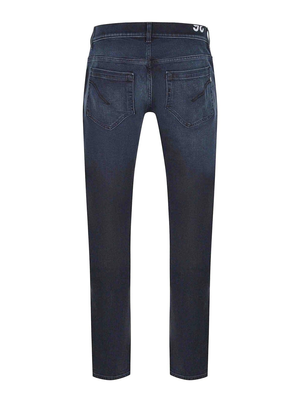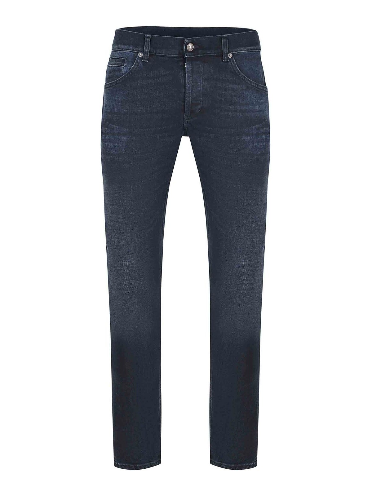 Vaqueros Dondup confeccionados en mezclilla azul oscuro, cintura baja, cierre con botones, trabillas en la cintura, cinco bolsillos, corte ajustado. 99% algodón, 1% elastano. Hecho en Italia