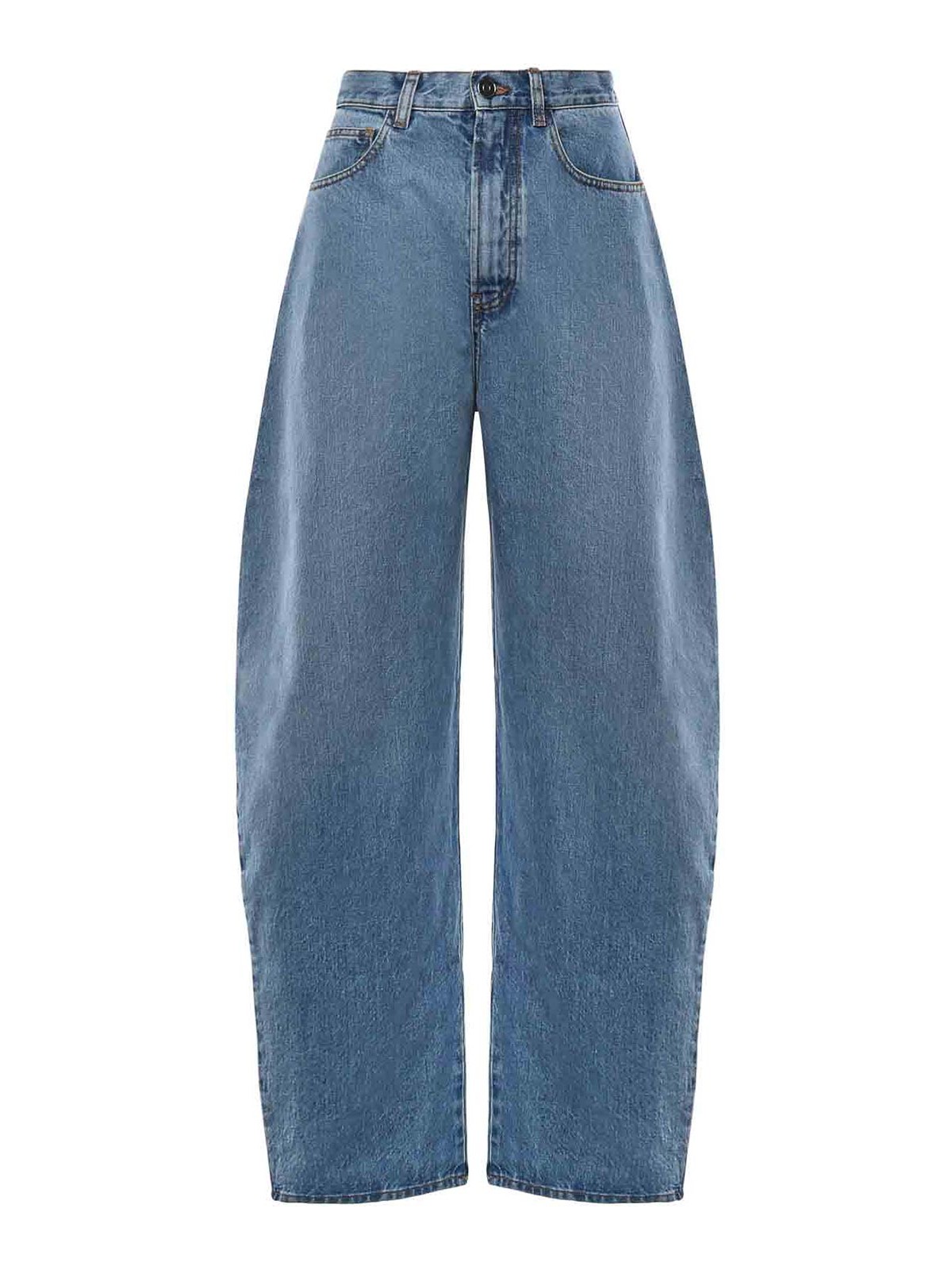 confeccionado en mezclilla de algodón, cintura alta, cinco bolsillos, cierre con cremallera y botón, fabricado en Italia, la talla que se muestra es 36, color del diseñador: azul turbio