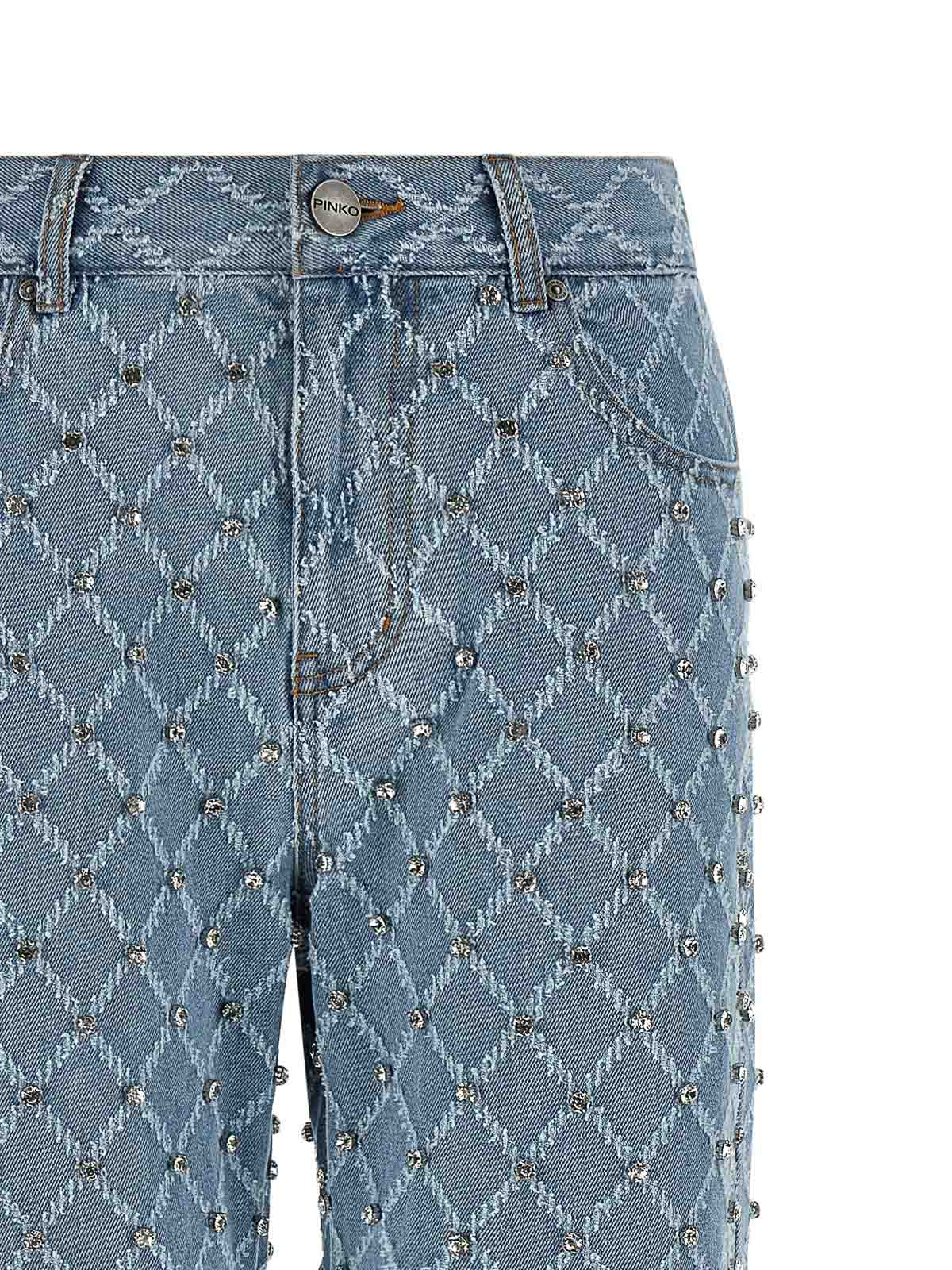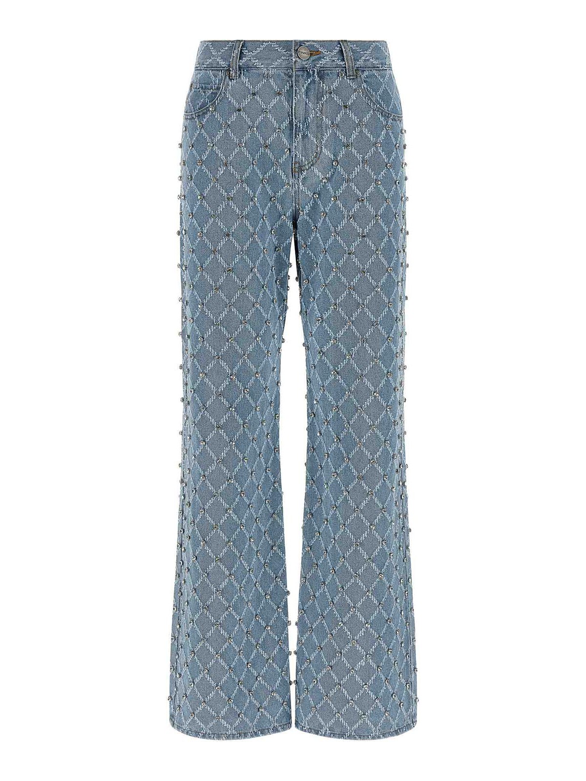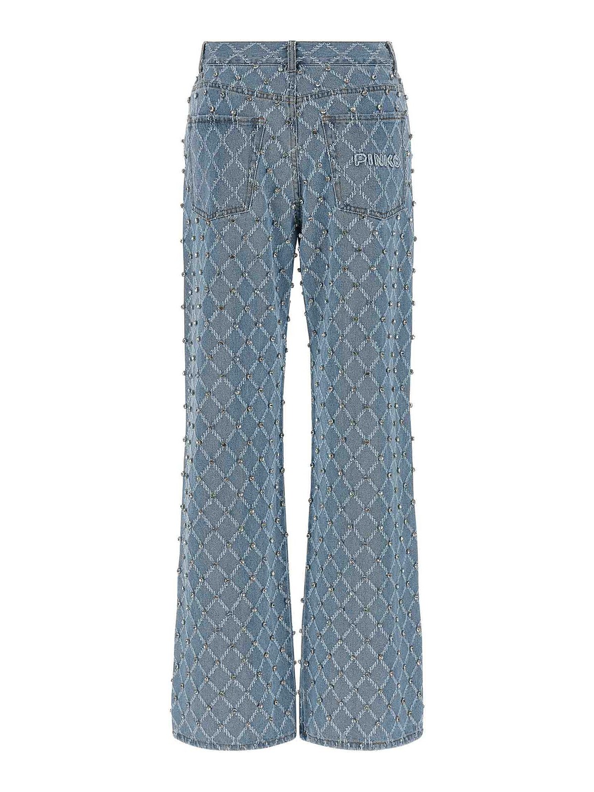 Vaqueros vaqueros de algodón de Wanda con estampado de diamantes en jacquard y apliques de cristal en toda la superficie, costuras en contraste, cierre frontal con cremallera y botón, cinco bolsillos, pernera ancha y bordado con el logotipo en la espalda.