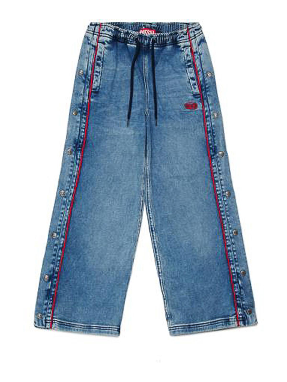 Vaqueros con botones azules, cintura elástica con cordón, bolsillos laterales, bolsillos traseros remendados, borde rojo, abertura lateral