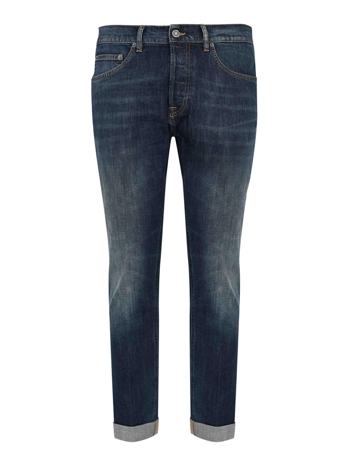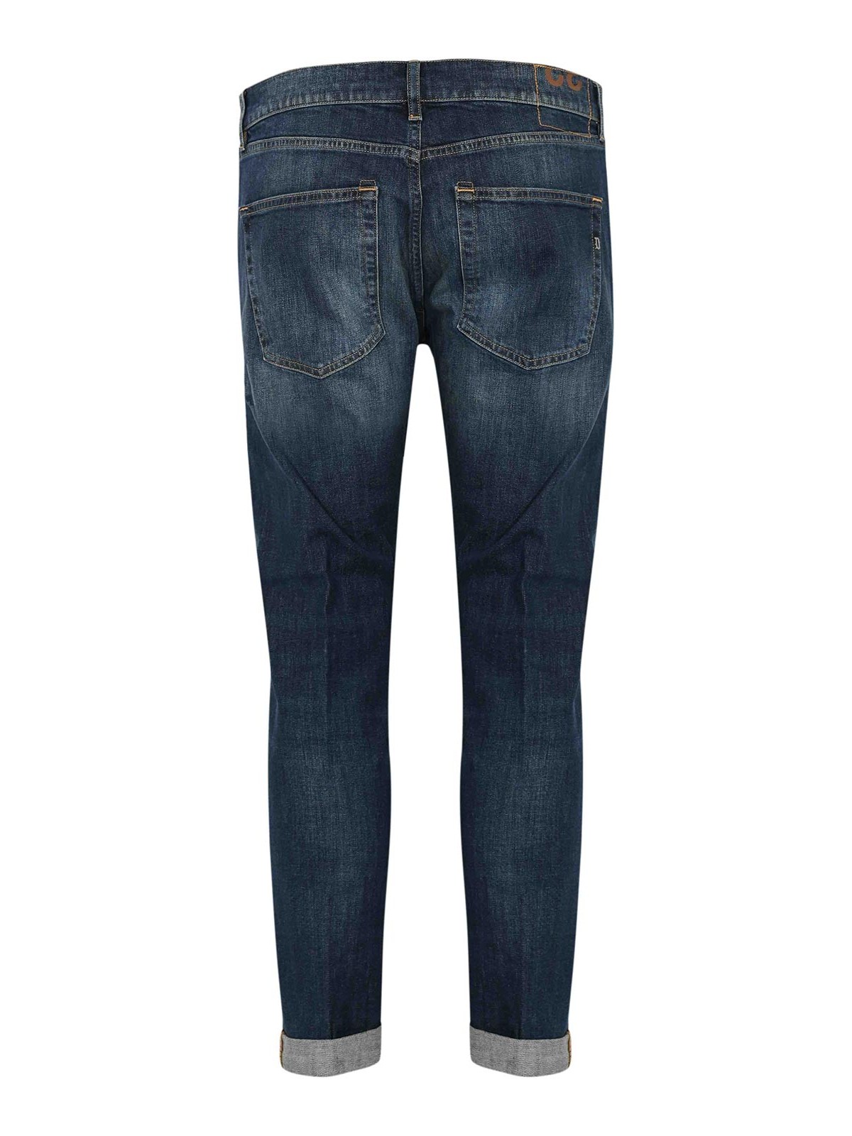 vaqueros dondup, modelo icon tejido: algodón elástico estampado: azul liso con un lavado medio y ligero y un efecto desgastado Cintura: talle medio con trabillas Cierre: bolsillo frontal con botones y cremallera: longitud clásica de cinco bolsillos: largo con dobladillos enrollados Detalles: costuras en contraste, logotipo de metal dondup en el bolsillo trasero, efecto desteñido en las piernas, diseño limpio y moderno forrado: sin ajuste: regular