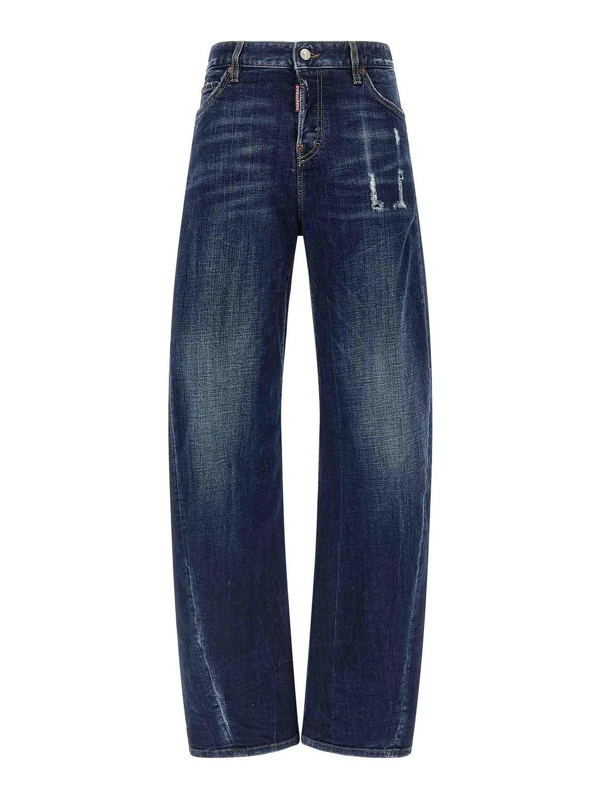 vaqueros holgados confeccionados en mezclilla de algodón ligeramente elástico con detalles de efecto destruido, estilo de 5 bolsillos con botones, costuras curvas y logotipo en la parte delantera en la solapa.