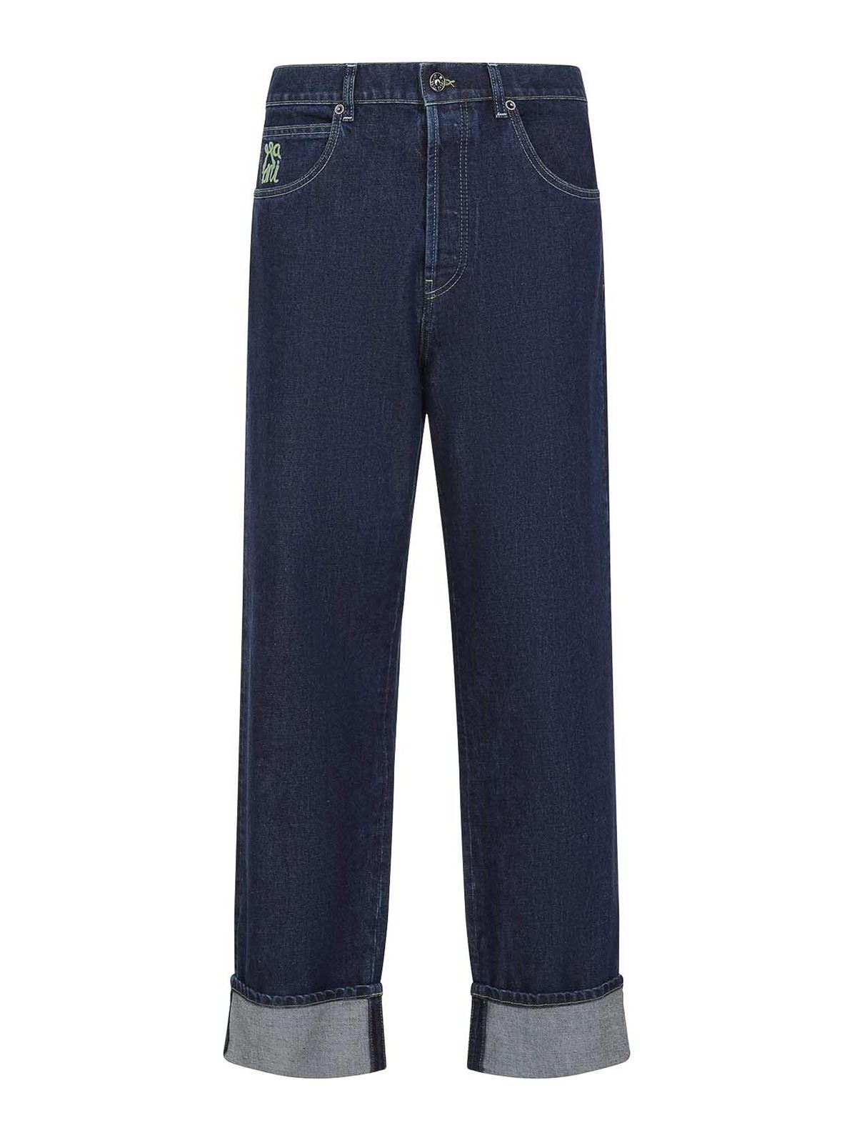 Vaqueros de algodón azul Marni. Vaqueros con 5 bolsillos confeccionados en mezclilla de algodón azul, con trabillas para el cinturón, cierre con botón en la parte delantera y cierre con cremallera, logotipo bordado en la parte delantera, etiqueta de la marca en la parte posterior de la cintura y dobladillos doblados.